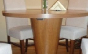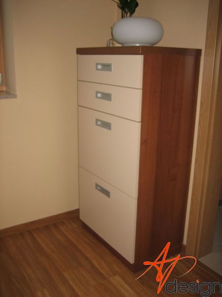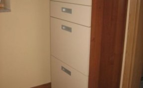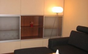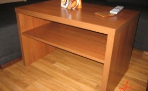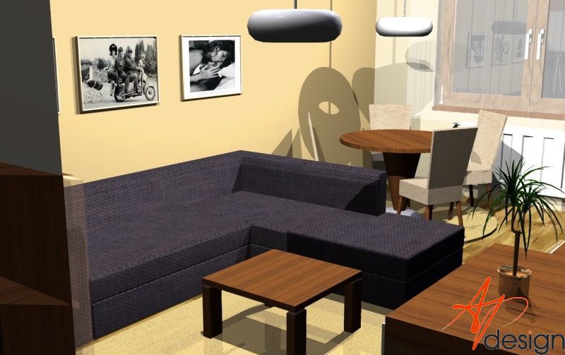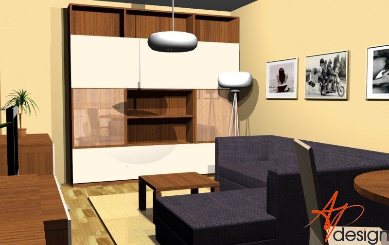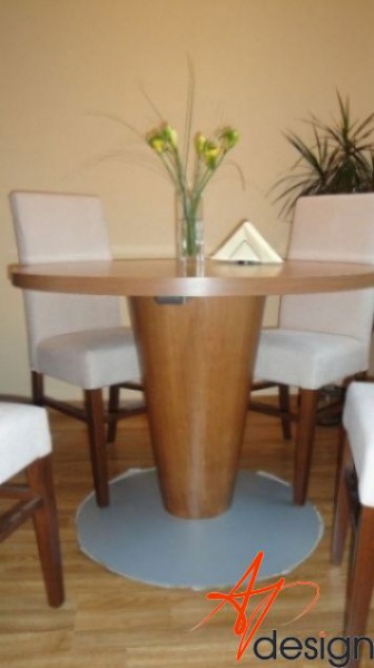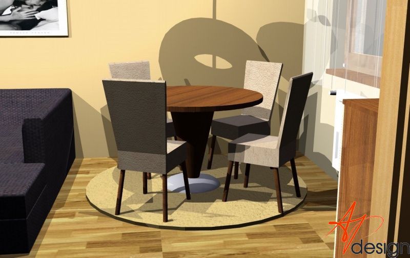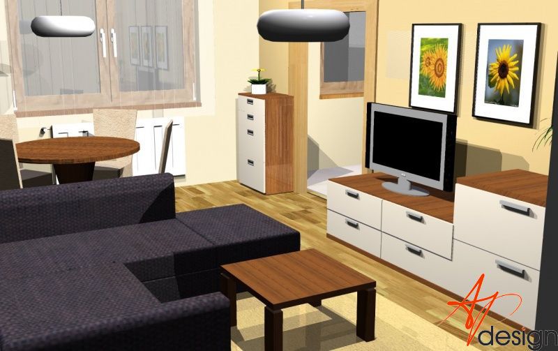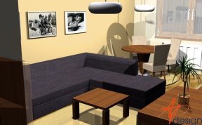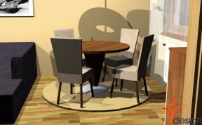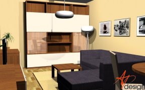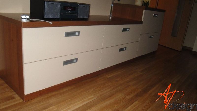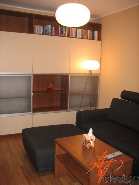 Klientka měla předem představu o odstínu nábytku. Podařilo se jí přesvědčit alespoň o rozbití prostoru příjemnou krémovou barvou, která odstín ořechu doplnila o eleganci. Dominantní knihovna se skládá z výsuvá a výklopů a doplňují ji dvířka z hliníkových rámečků s výplní ze skla satinato. TV skříňku tvoří především výsuvy na DVD a CD. Přáním klientky byl kulatý stůl. Bohužel pořádné stoly se prodávají za pořádné ceny, takže jsme klientce navrhli několikanásobně levnější variantu - podnož od Hettichu, domořená do ořechu a deska tl. 36 mm v odstínu ořech.