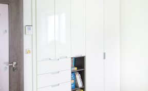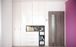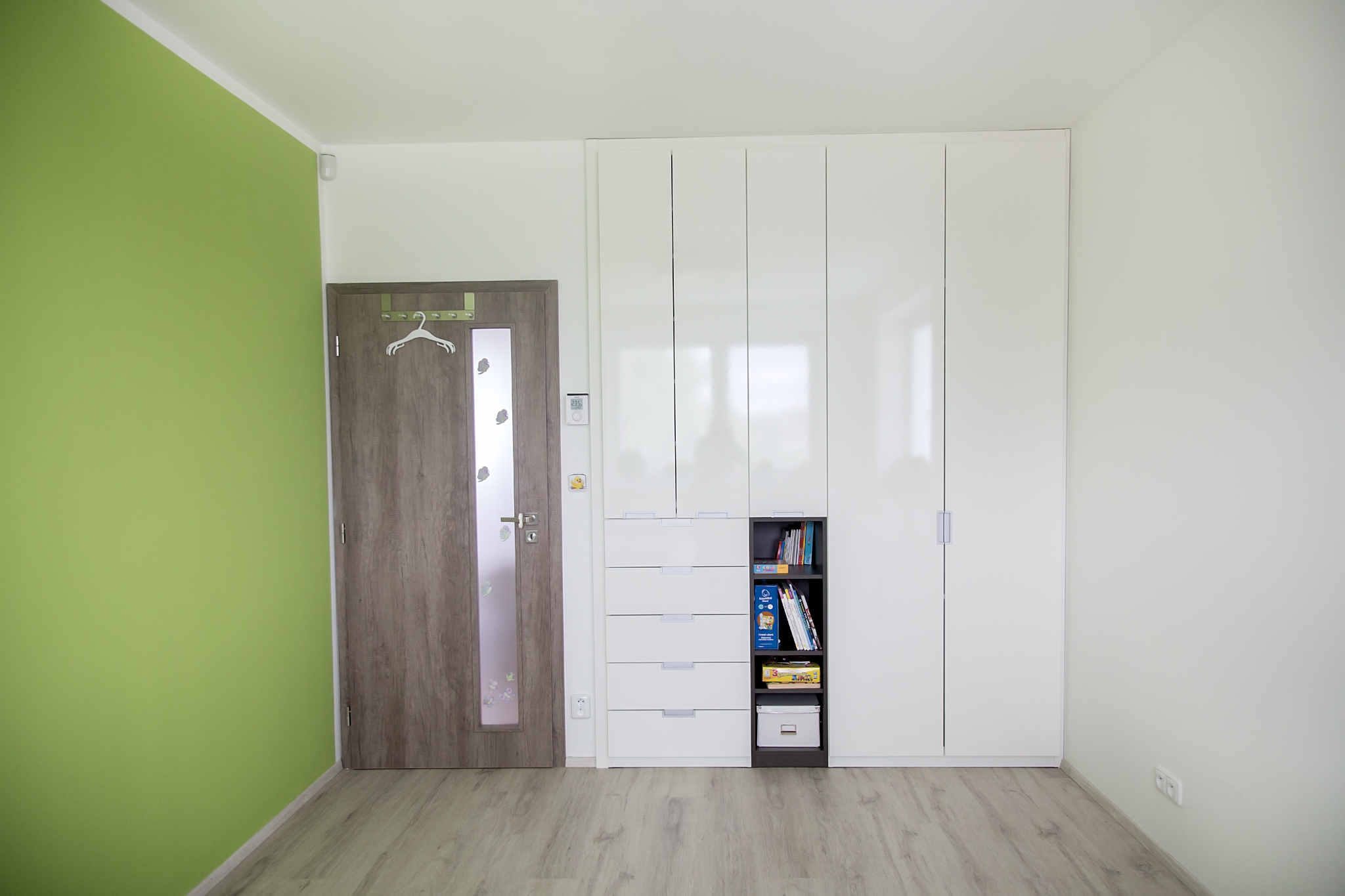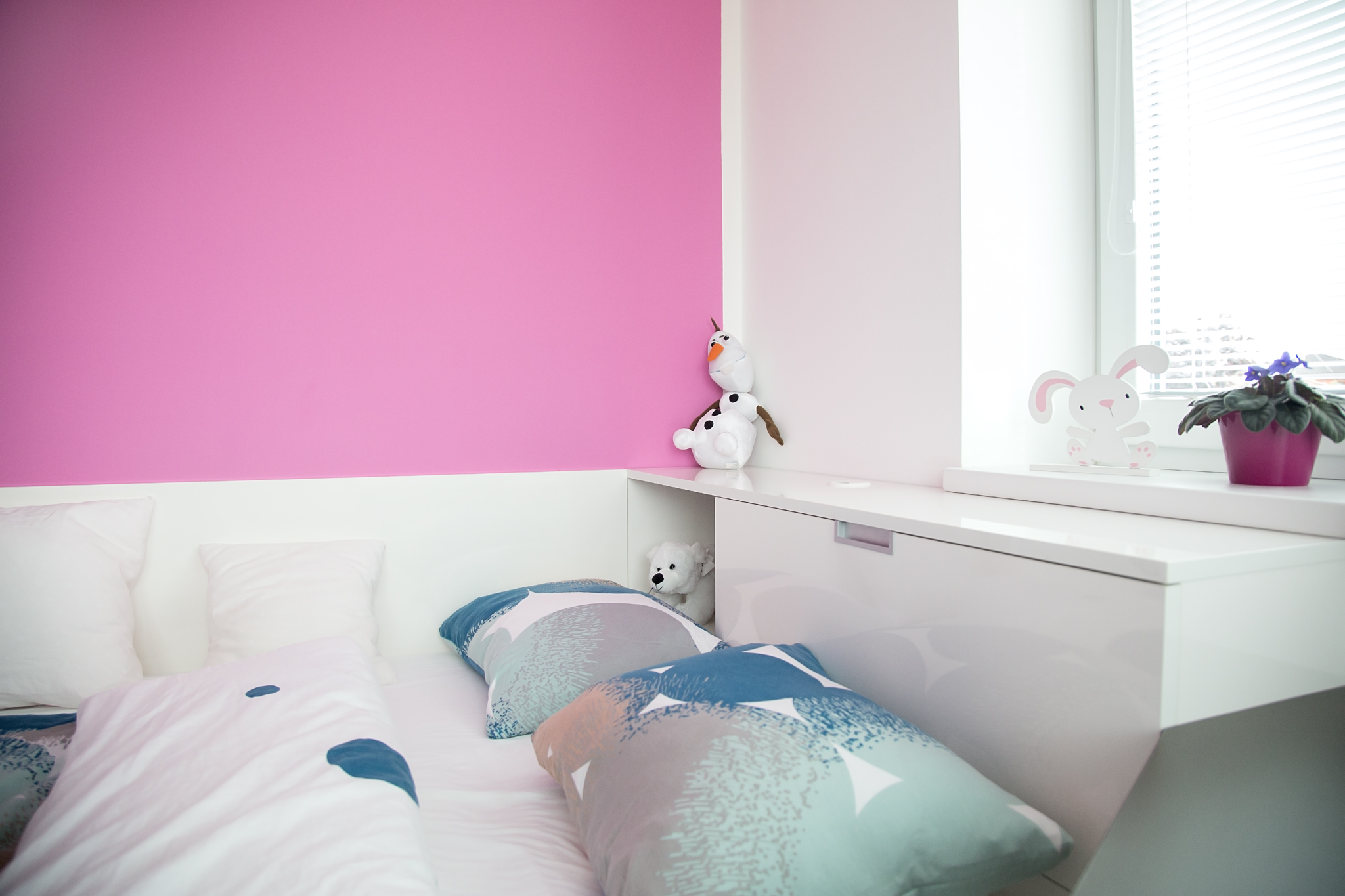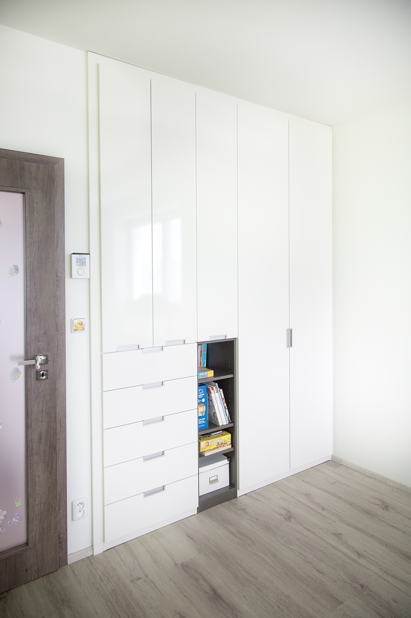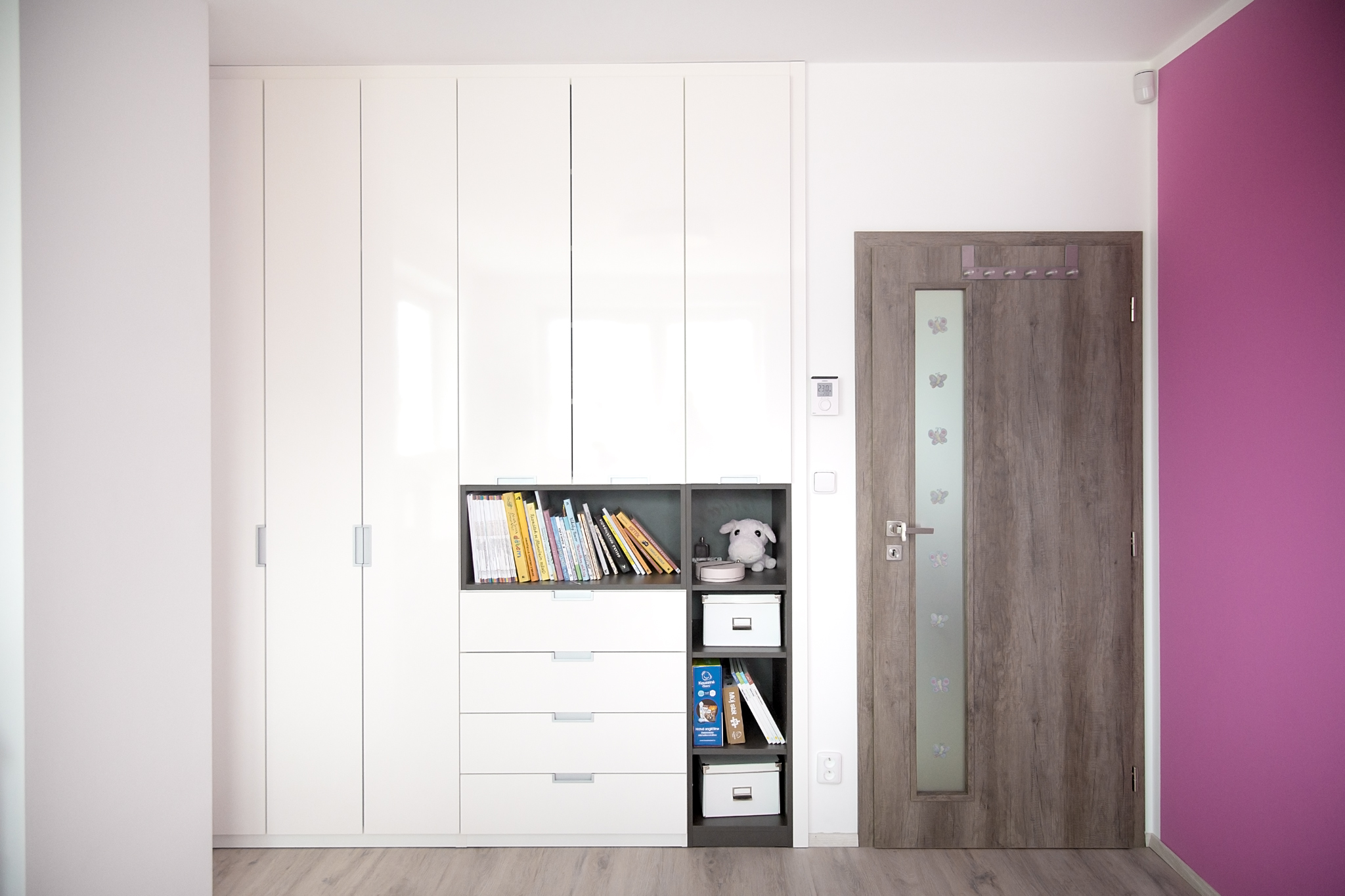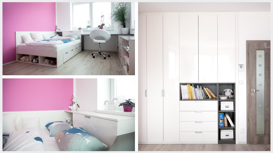 Nábytek jsme zvolily bílý v kombinaci s tmavě šedou (Láva). Jednoduchost jsme rozbily barevnými stěnami.