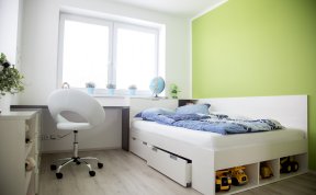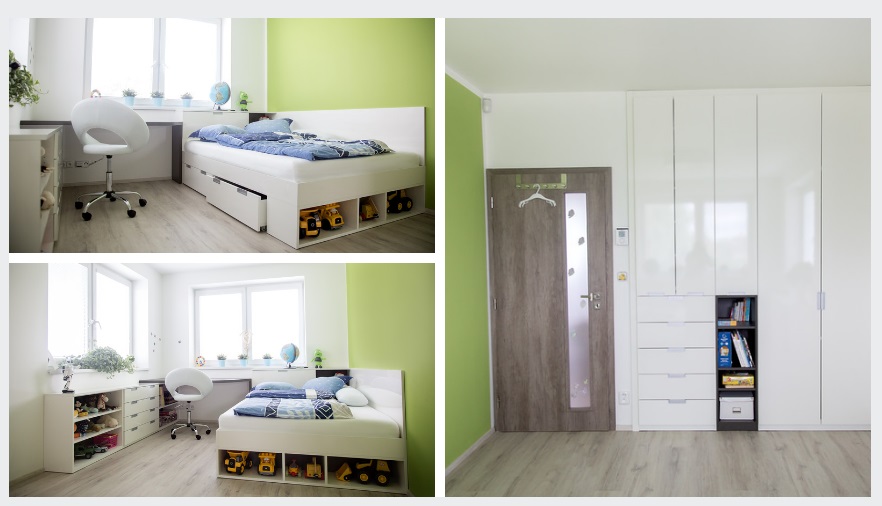 Požadavek byl na prostorné postele, aby mohl/a případně u dětí přespat kamarád/ka a nemusela se řešit nějaká skrytá postel. Pokoje jsou velké, takže s rozvržením prostoru nebyl velký problém a s mladou maminkou jsme se shodli hned u první varianty dispozičního řešení.