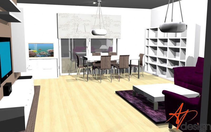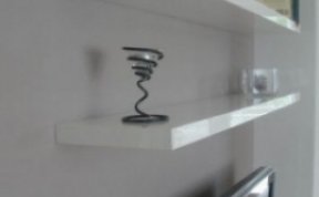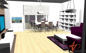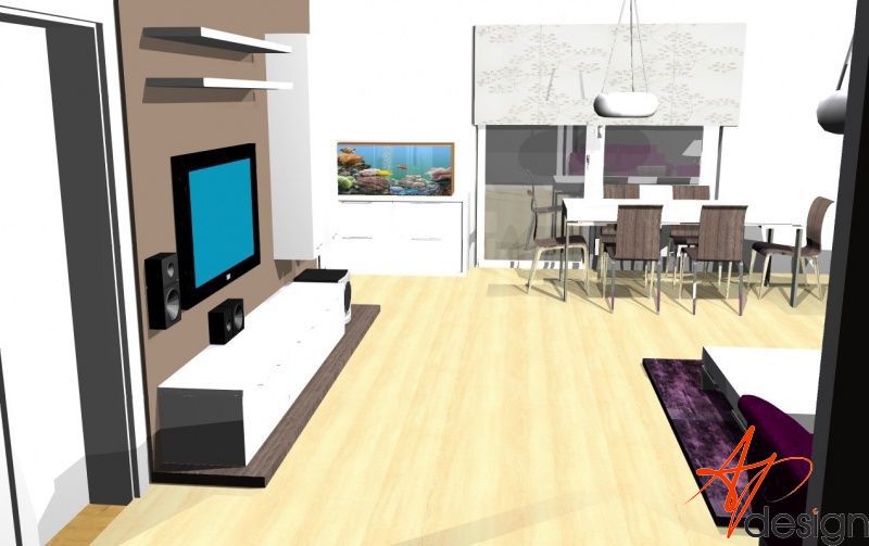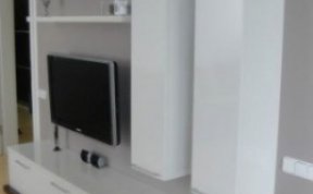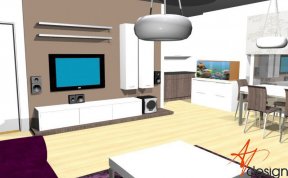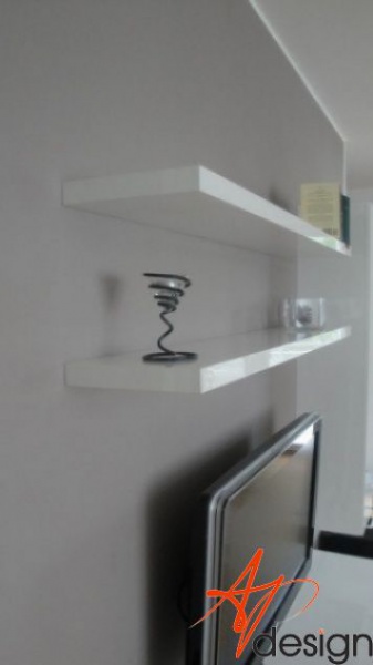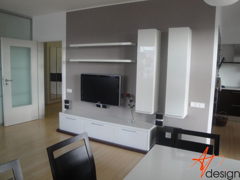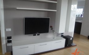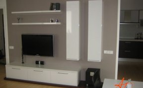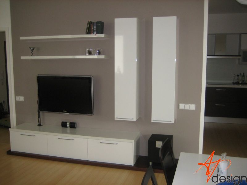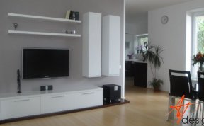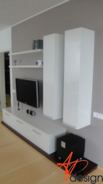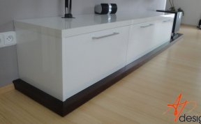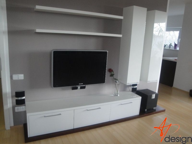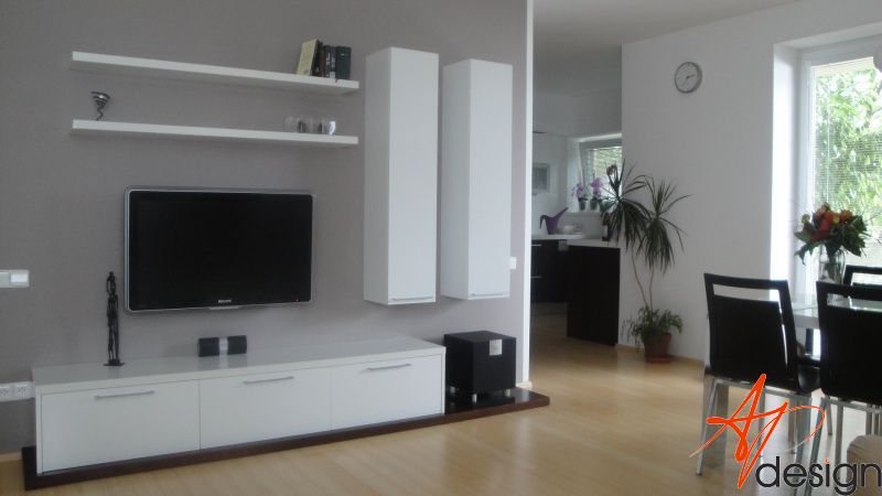 Sestava se skládá ze dvou vysokých zavešených skříněk, uvnitř s policemi, dvou polic na vruty a spodní výklopné skříňky se třemi moduly. Celá sestava je posazená na dýhované desce, která má nesouměrný přesah. Bylo nutné umístit subbufer, který měl příjemné rozměry a pod horní skříňky sympaticky zapadnul. Celá bíle lakovaná sestava je vzdušná a přitom výrazná.