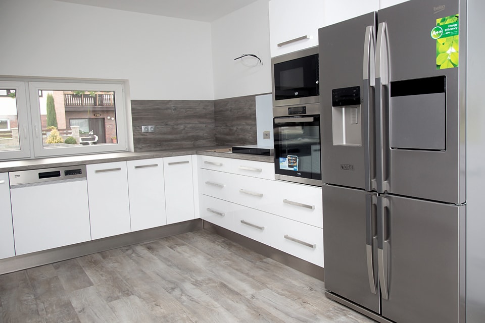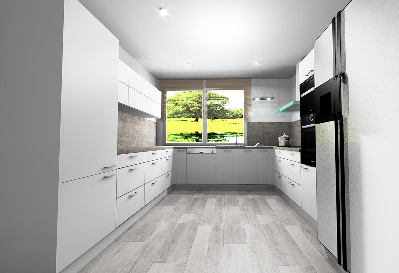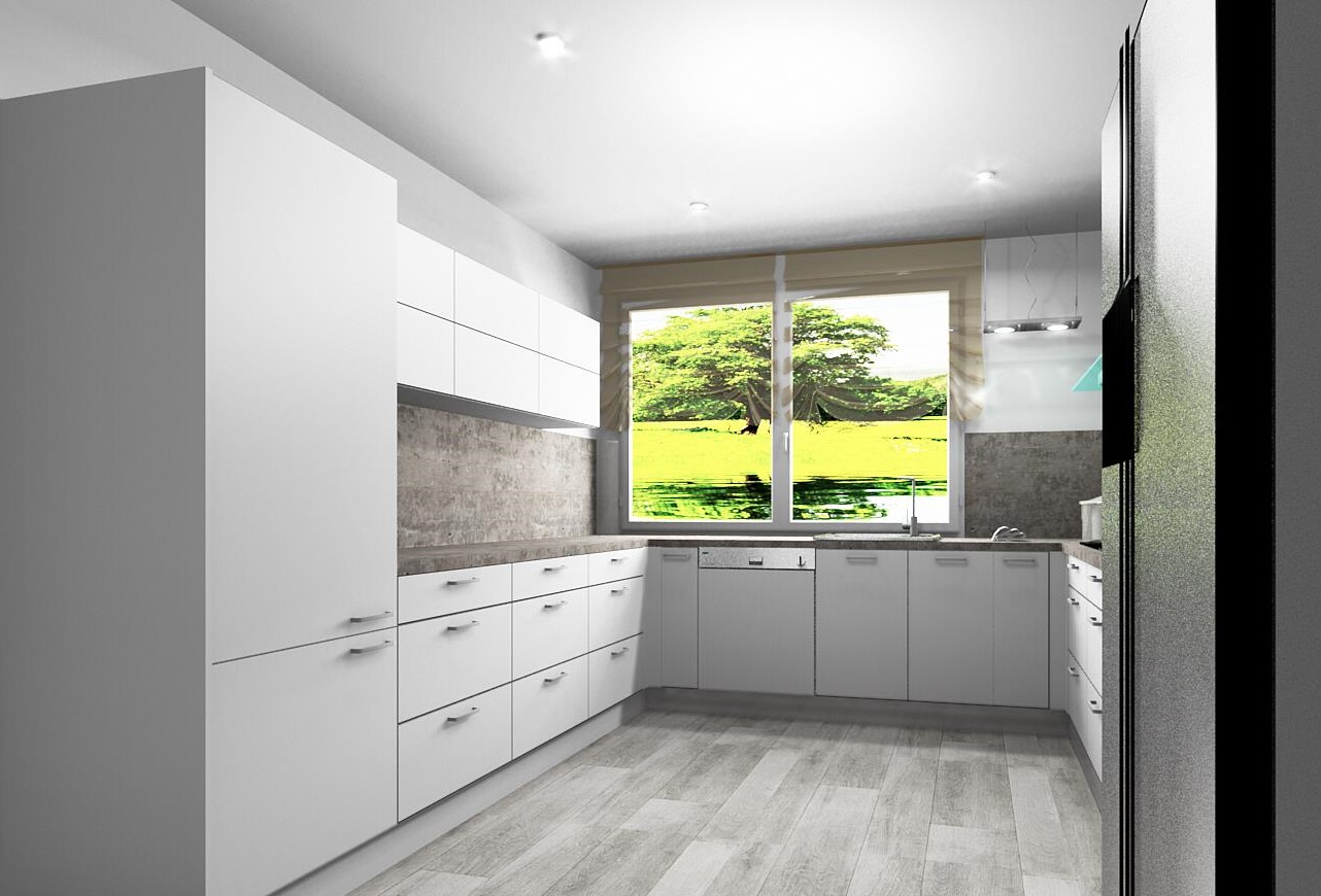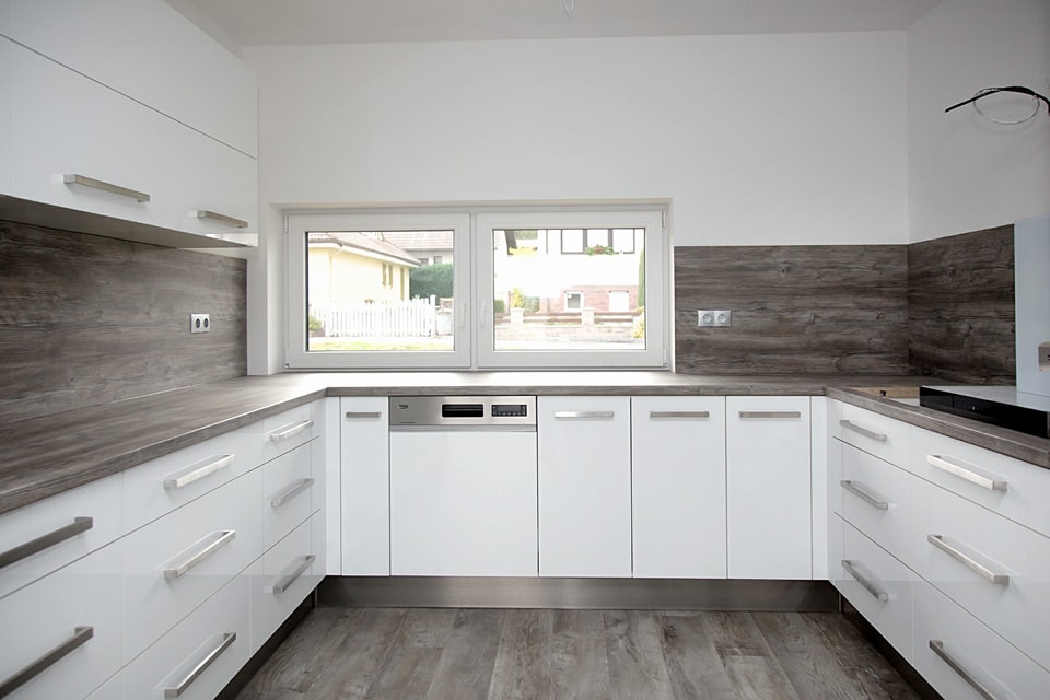 Kuchyň dle požadavků klientky měla být bílá s dřevěným dekorem na pracovní desce a zádech kuchyňské linky. Podlaha i barva okna byla jasně daná, takže jsem se jen přizpůsobila.
