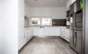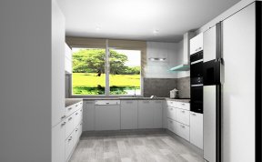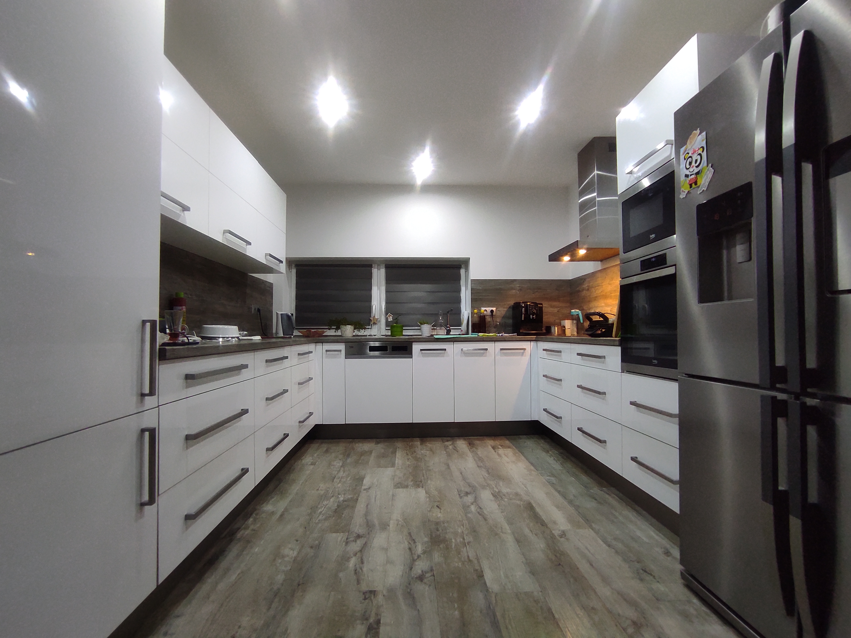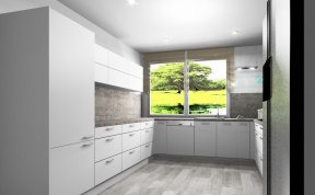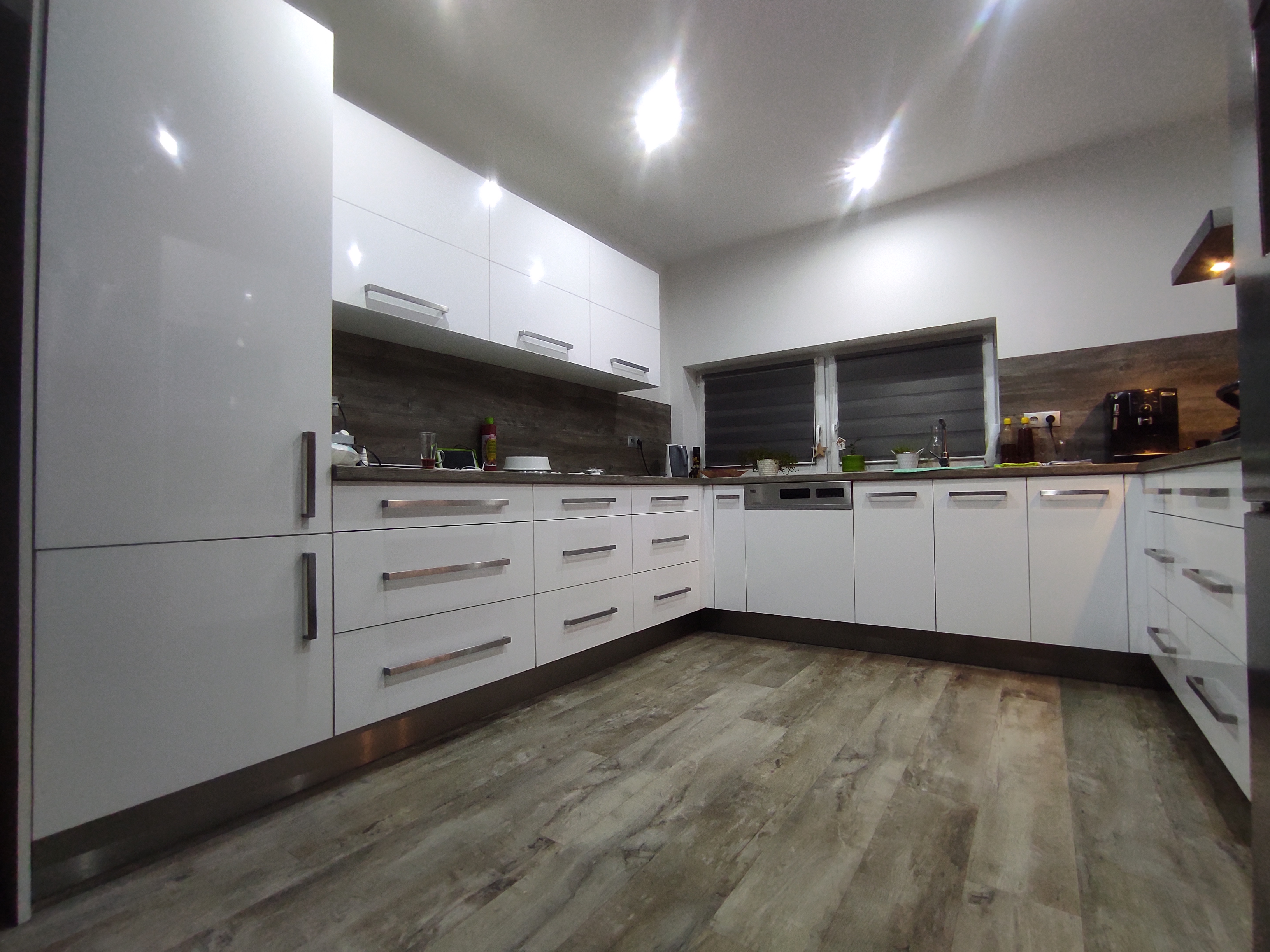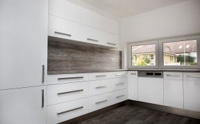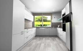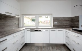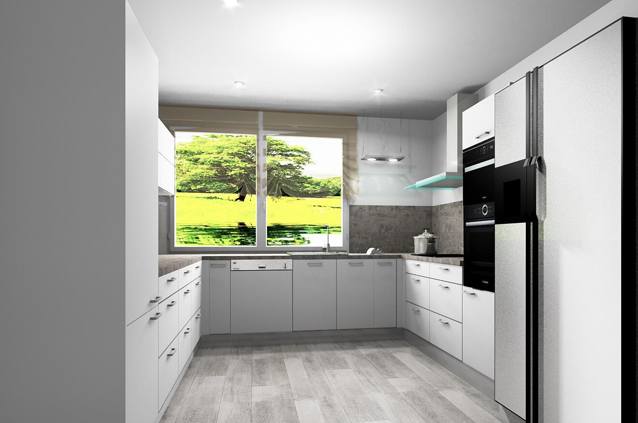 Kuchyň dle požadavků klientky měla být bílá s dřevěným dekorem na pracovní desce a zádech kuchyňské linky. Podlaha i barva okna byla jasně daná, takže jsem se jen přizpůsobila.