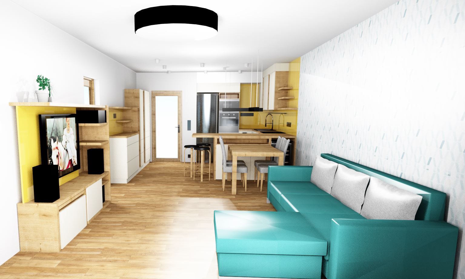 • Realizace kuchyně s obývákem v dekoru mint-bílošedá-Hickory přírodní
