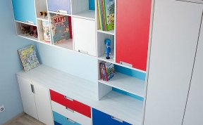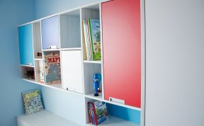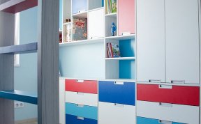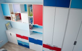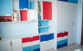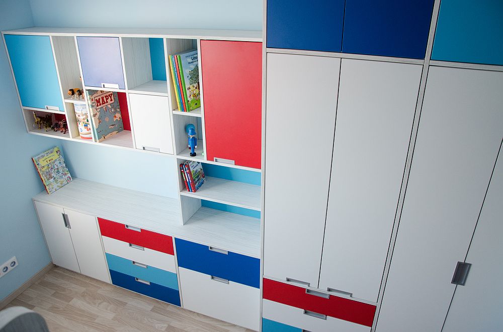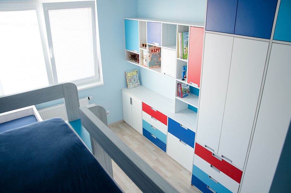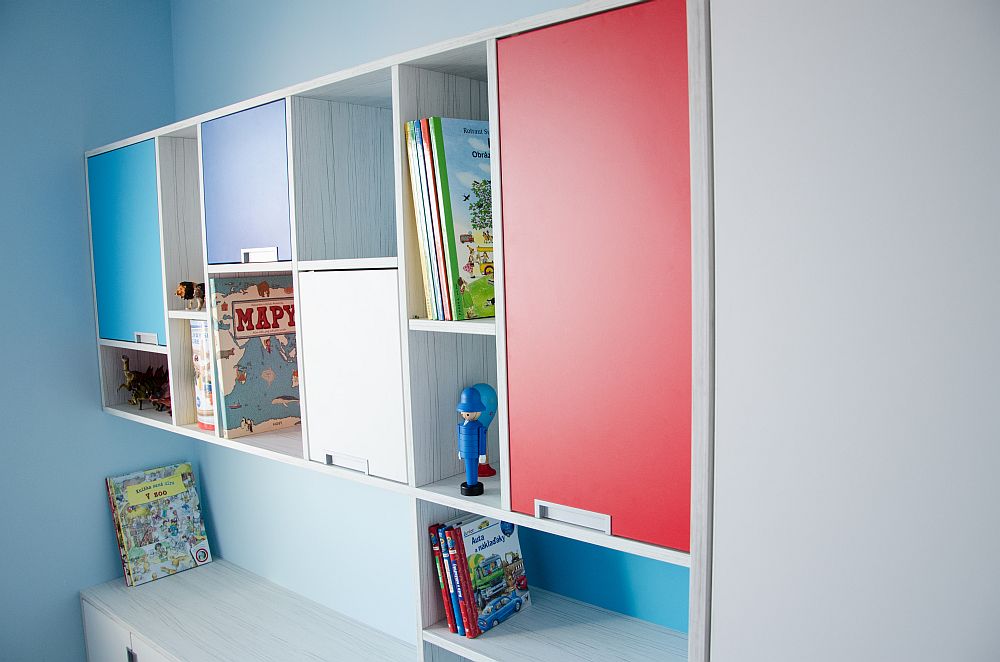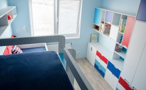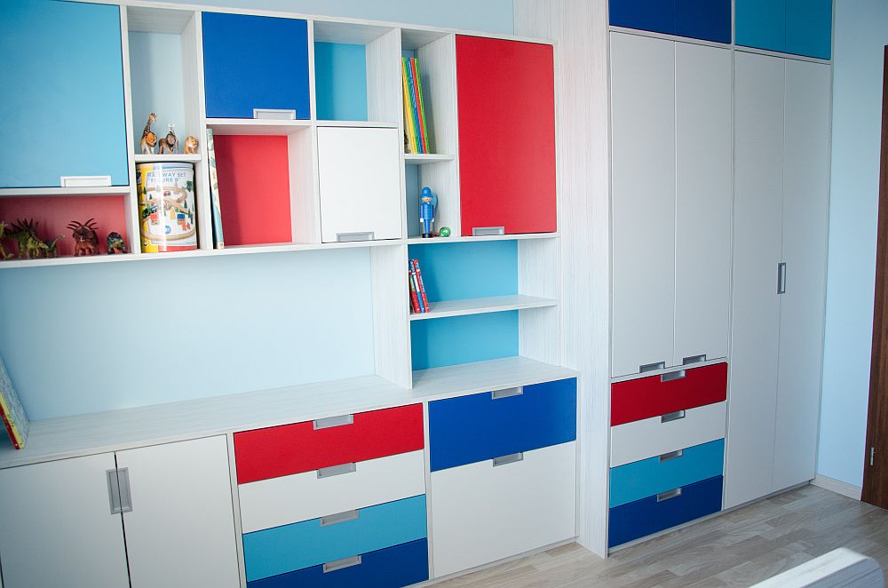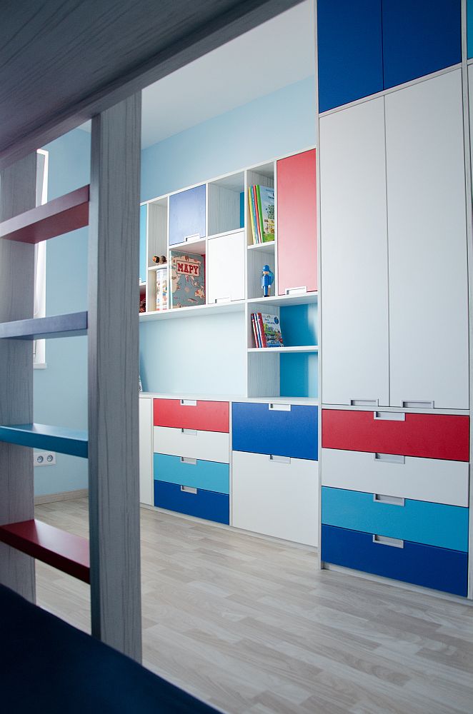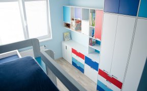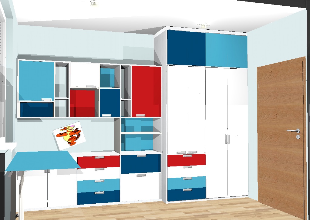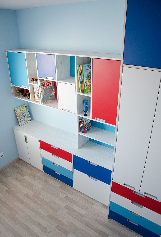 Vzhledem k pracovně umístěné vedle pokojíčku jsem v prostoru nemusela řešit pracovní stoly. Ty se klienti rozhodli umístit tam. Tím pádem zbylo dost místa na úložné prostory pro oblečení i hračky a později pro zájmové pomůcky. A zbyl i kousek na hraní.