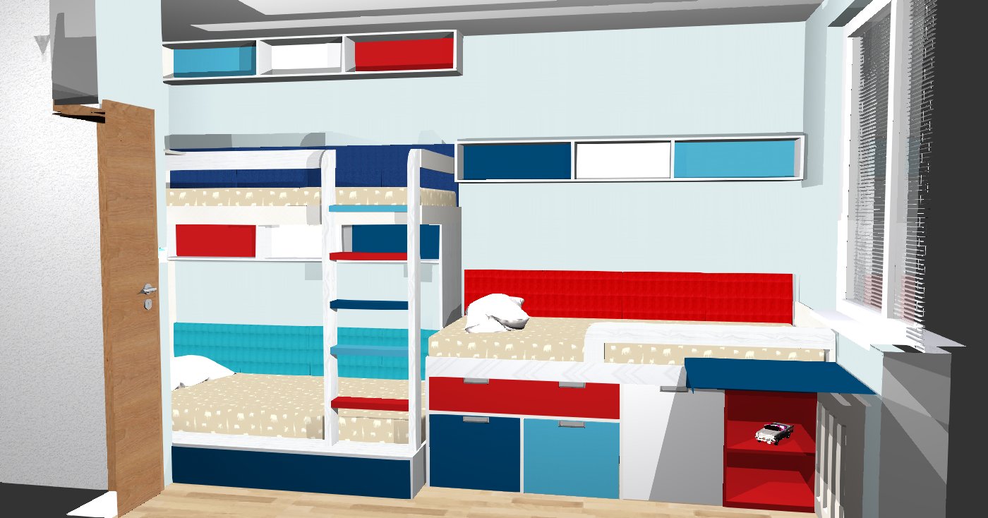 Když jsem ke klientům přišla, tak jsem dostala zadání dětského pokoje : pro tři děti. Seznámila jsem se s předškolákem a jeho mladším bráškou, ale třetí dítě se teprve mělo narodit. Navíc jsme ani nevěděli, jestli to bude také kluk.