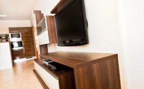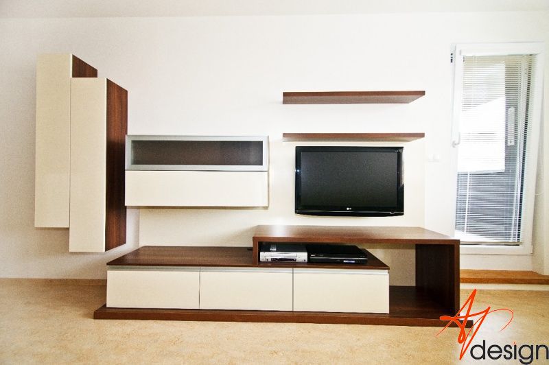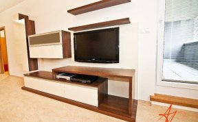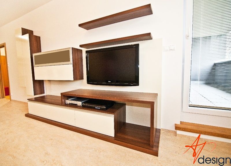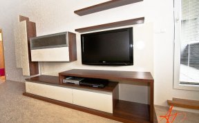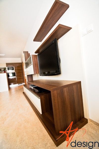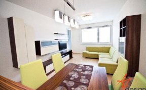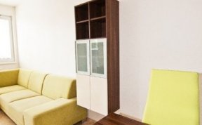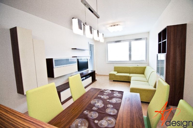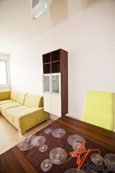 Požadavek kliena na obývák byl, co nejvíce sjednotit kuchyňský kout s prostorem obýváku... Barevně jsem se tedy držela vanilkové barvy, která se opakovala i na dvířkách kuchyně. Korpusy kuchyně byly v zebranu, ale to už klient opakovat nechtěl. Zvolila jsem proto ořech tabákový, který s lesklou vanilkou vytvořil hezký kontrast. Zelená sedací souprava příjemně doplnila ostatní nábytek.