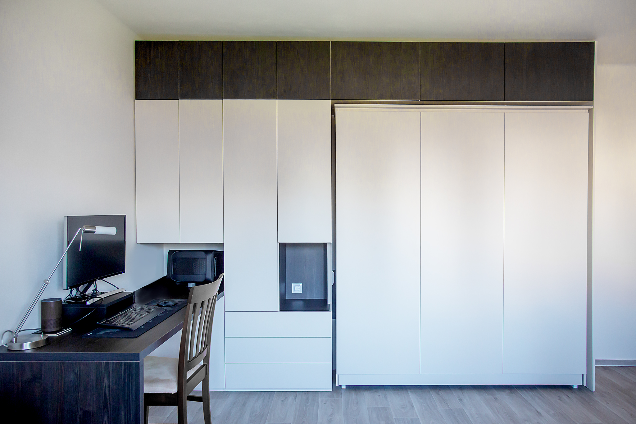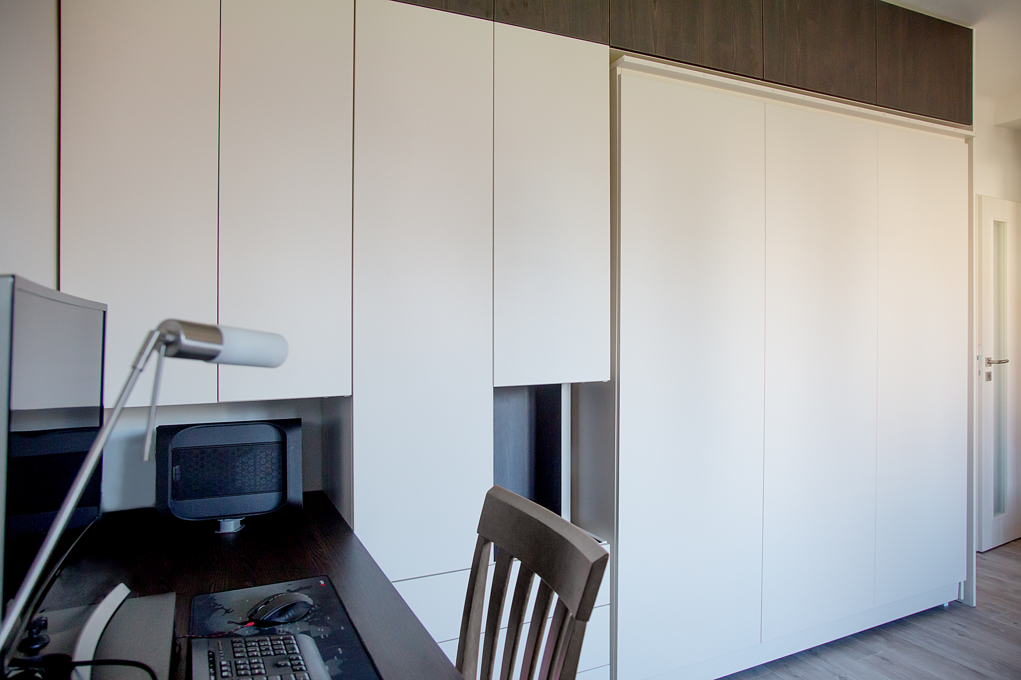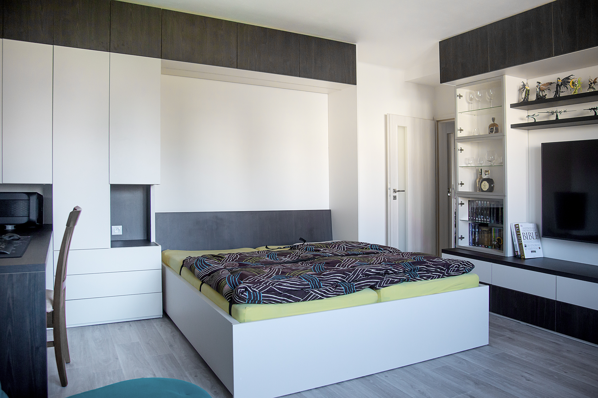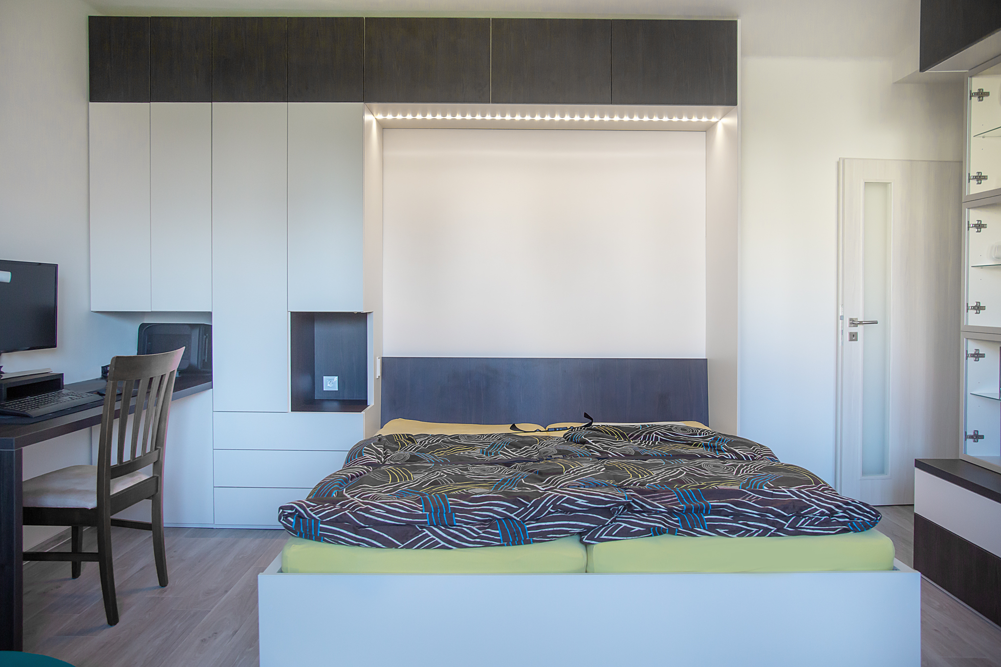 Byt 2+1 v Pelhřimovské ulici bylo nutné přizpůsobit fungování čtyřčlenné rodiny. Kluci potřebovali soukromí, takže rodiče obětovali ložnici, kde mohl pokoj vzniknout. Ale bylo nutné někam uložit rodiče a pro taťku vytvořit větší pracovní kout. Zkusili jsme v návrzích zvýšené patro, rozdělení obýváku atp. Nakonec zvítězil návrh se sklopnou postelí.