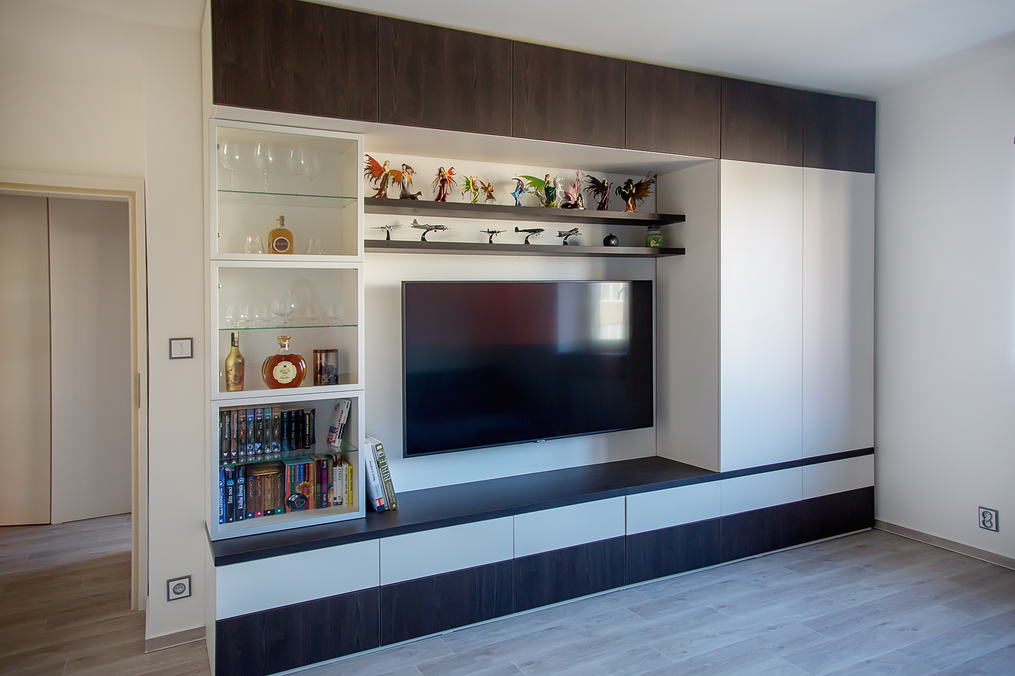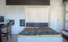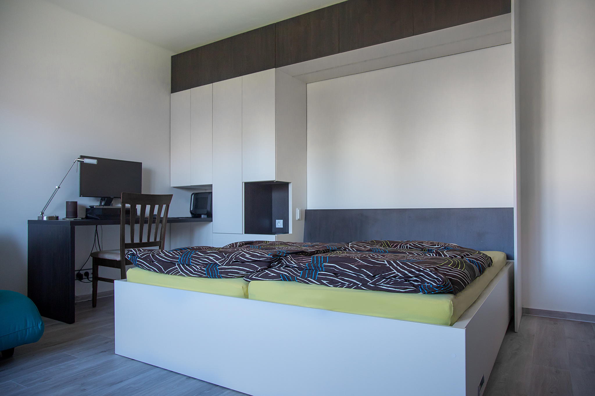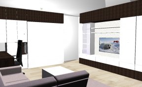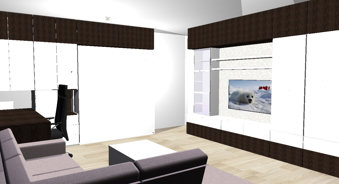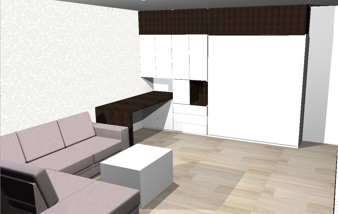 Byt 2+1 v Pelhřimovské ulici bylo nutné přizpůsobit fungování čtyřčlenné rodiny. Kluci potřebovali soukromí, takže rodiče obětovali ložnici, kde mohl pokoj vzniknout. Ale bylo nutné někam uložit rodiče a pro taťku vytvořit větší pracovní kout. Zkusili jsme v návrzích zvýšené patro, rozdělení obýváku atp. Nakonec zvítězil návrh se sklopnou postelí.