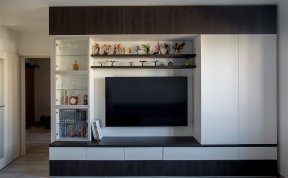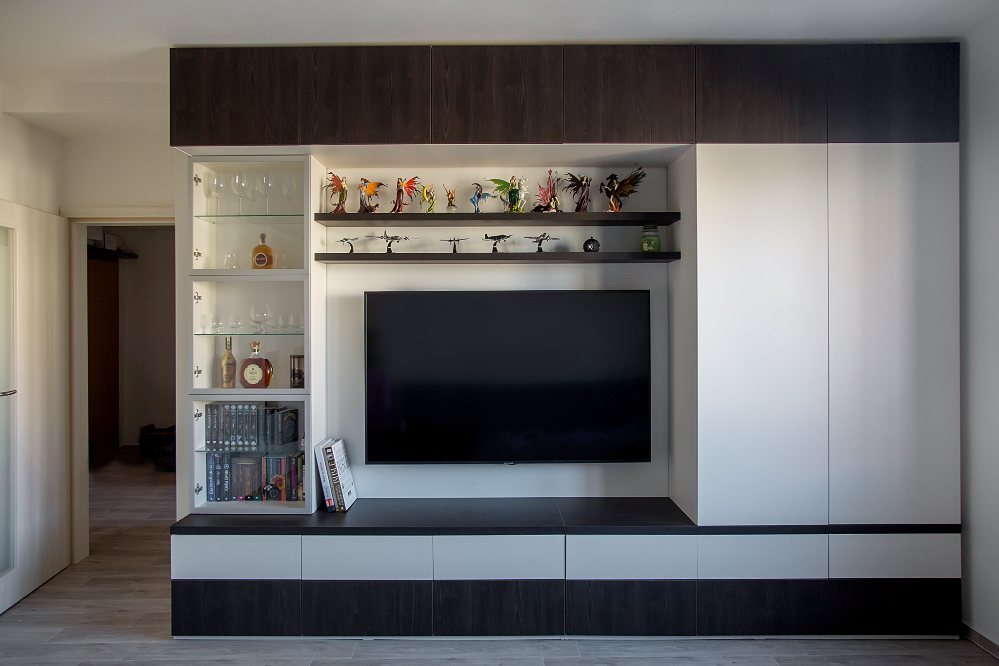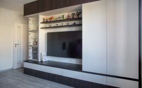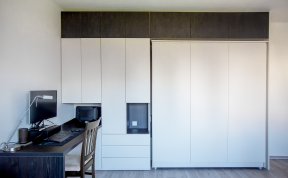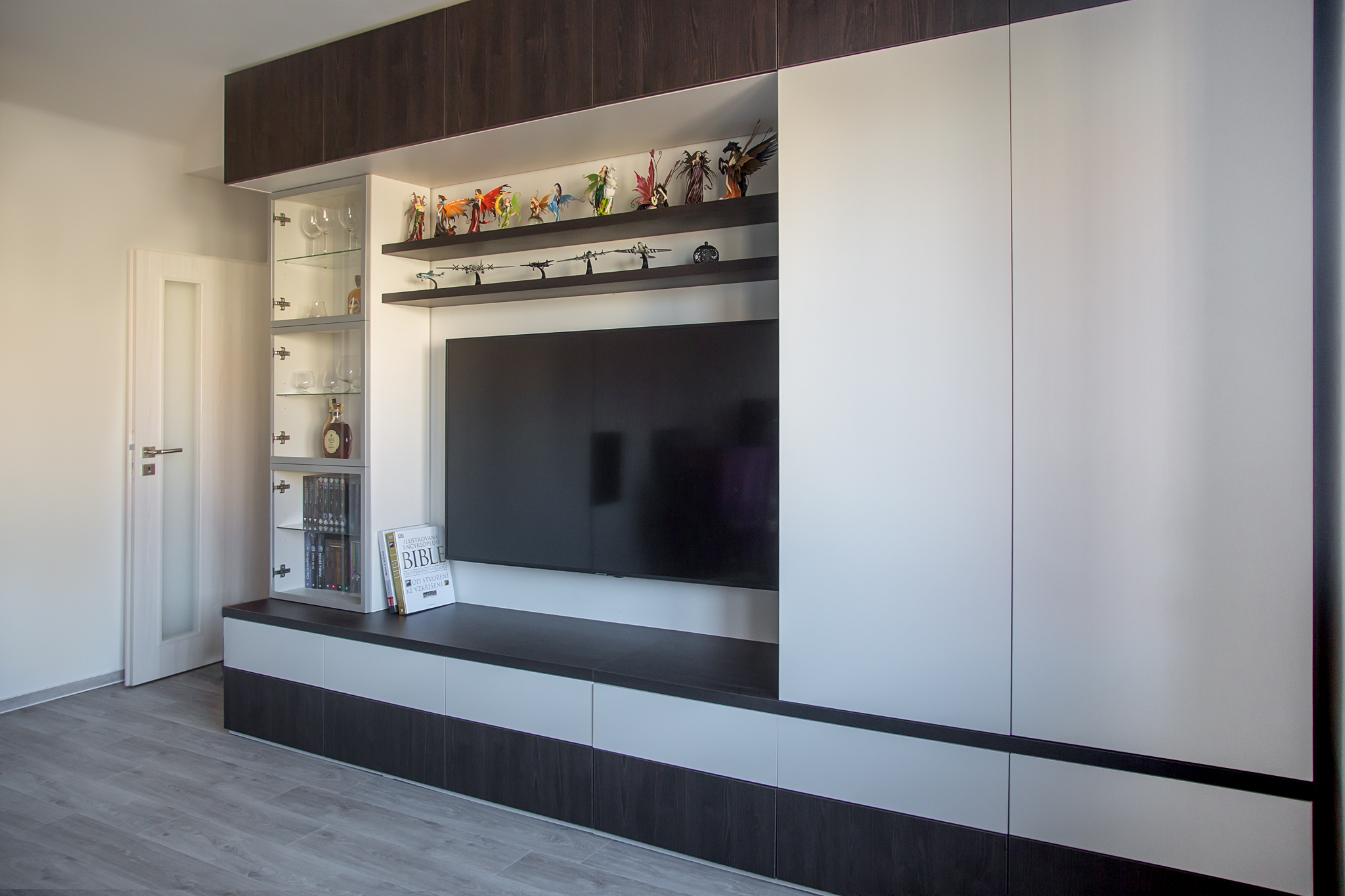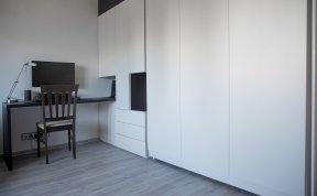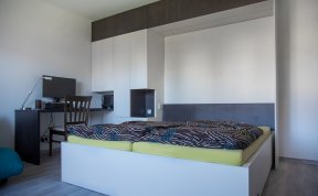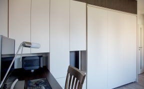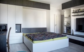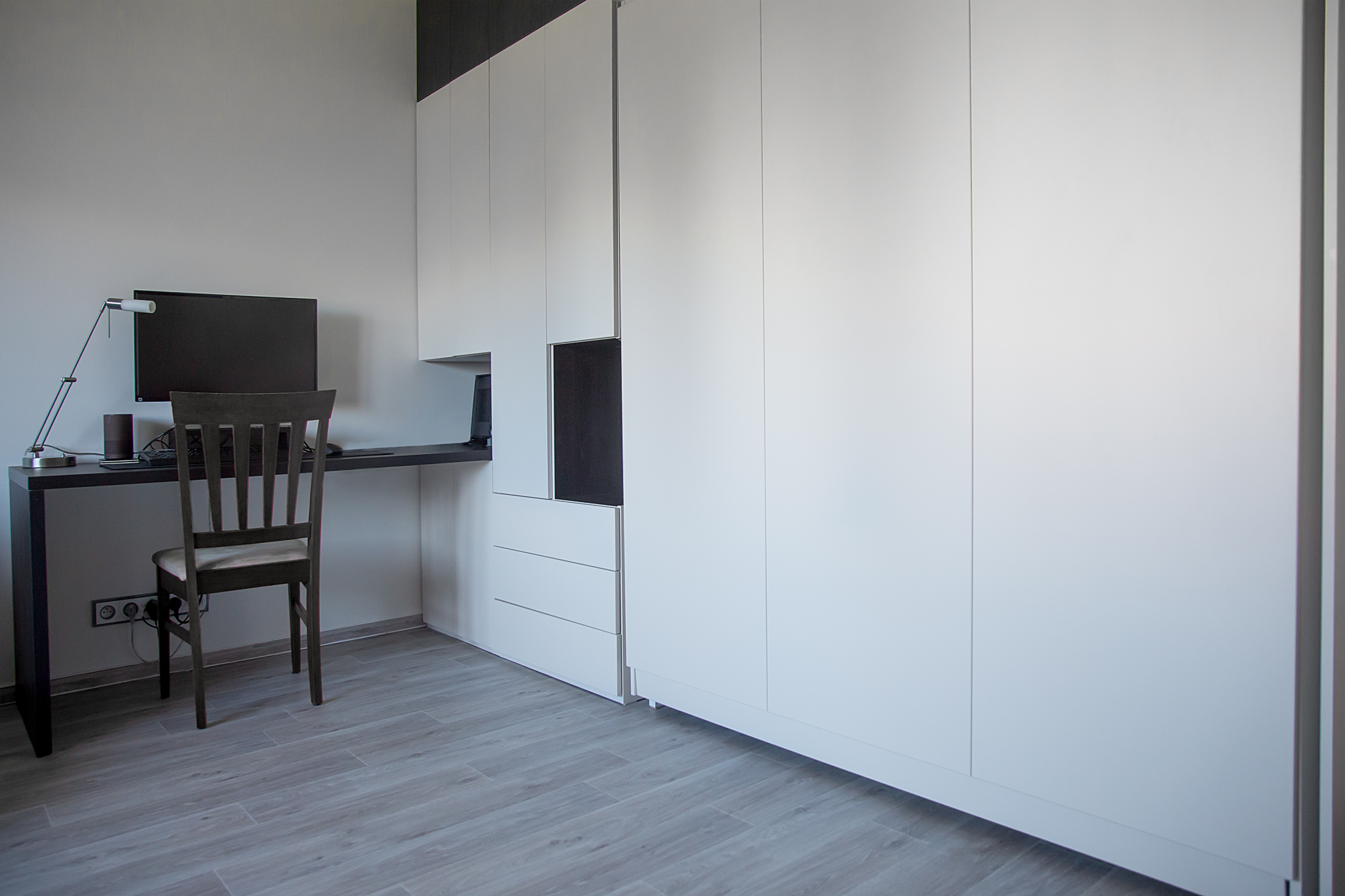 Byt 2+1 v Pelhřimovské ulici bylo nutné přizpůsobit fungování čtyřčlenné rodiny. Kluci potřebovali soukromí, takže rodiče obětovali ložnici, kde mohl pokoj vzniknout. Ale bylo nutné někam uložit rodiče a pro taťku vytvořit větší pracovní kout. Zkusili jsme v návrzích zvýšené patro, rozdělení obýváku atp. Nakonec zvítězil návrh se sklopnou postelí.