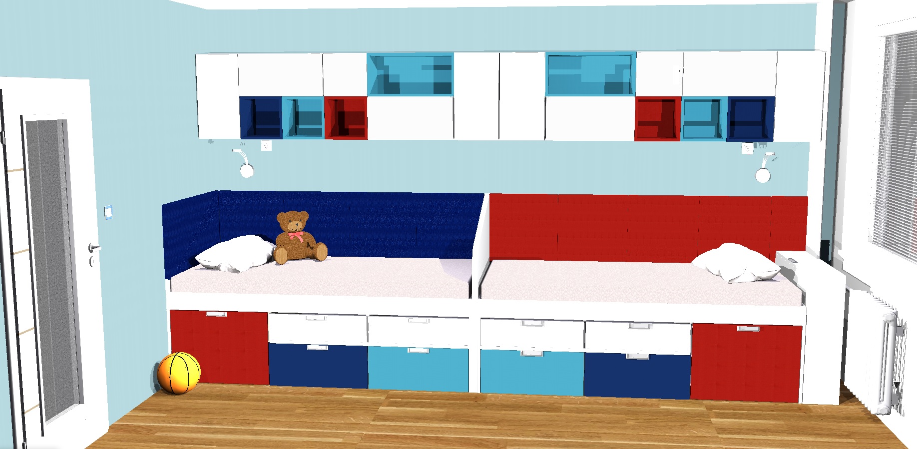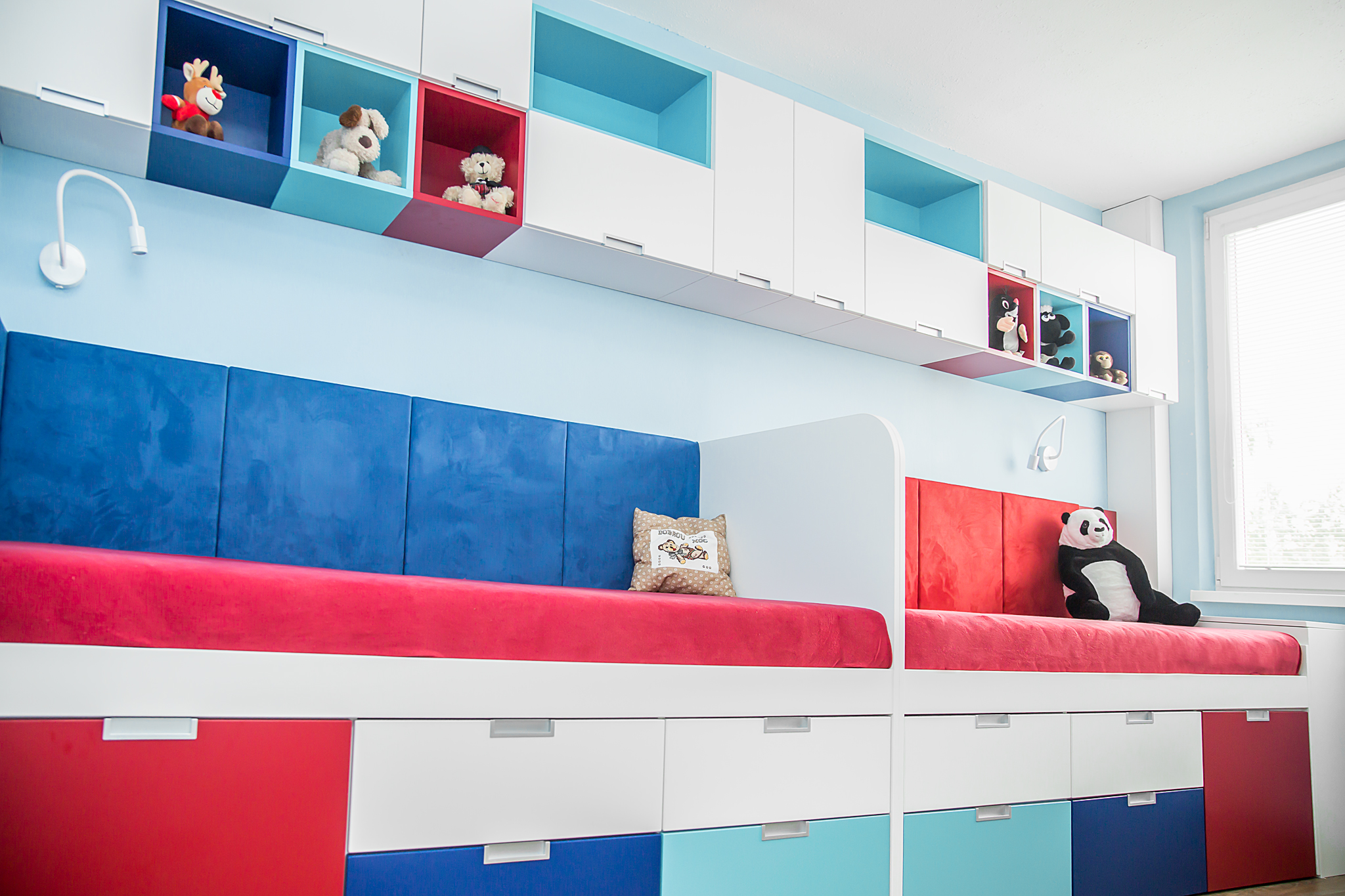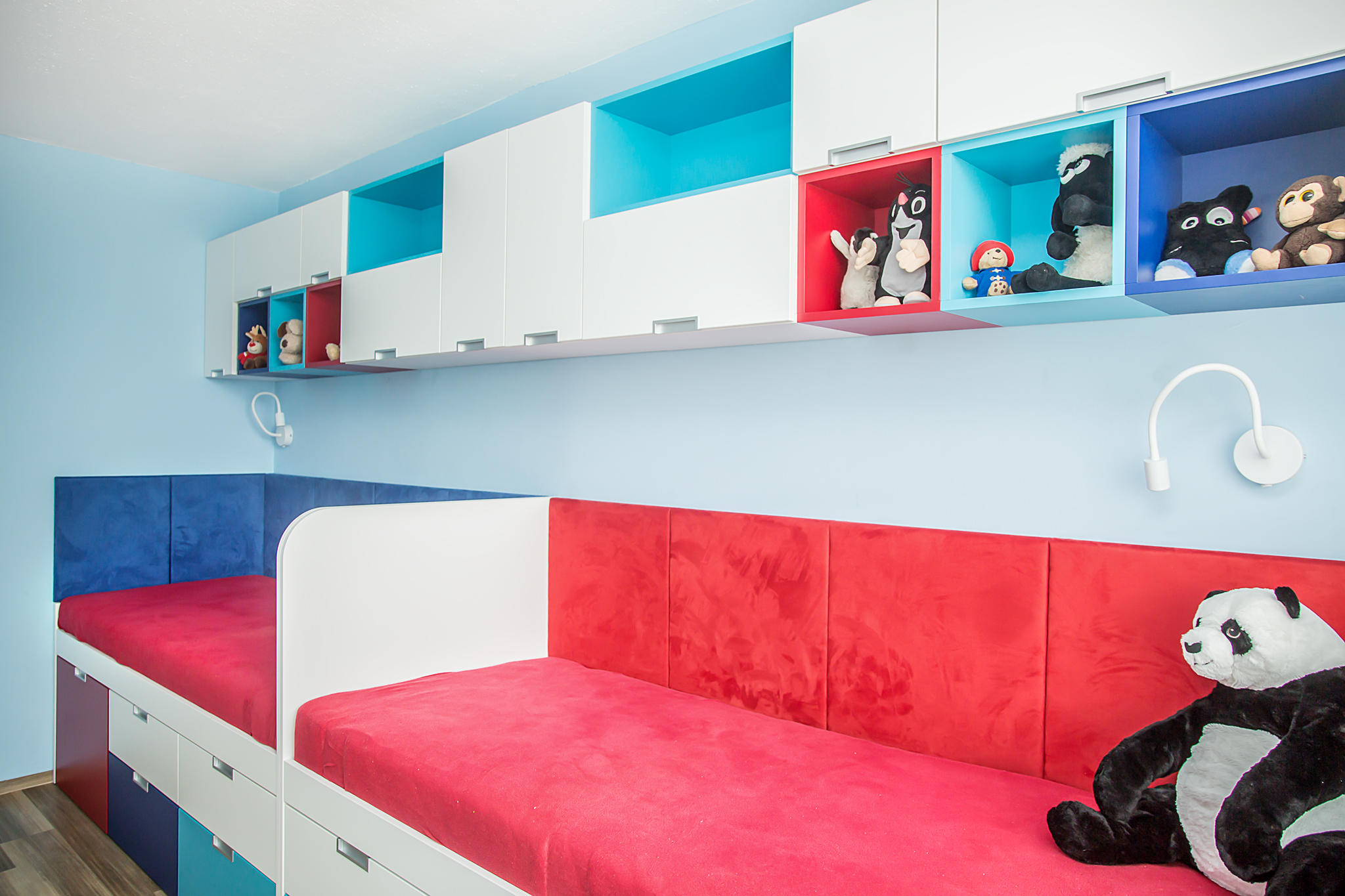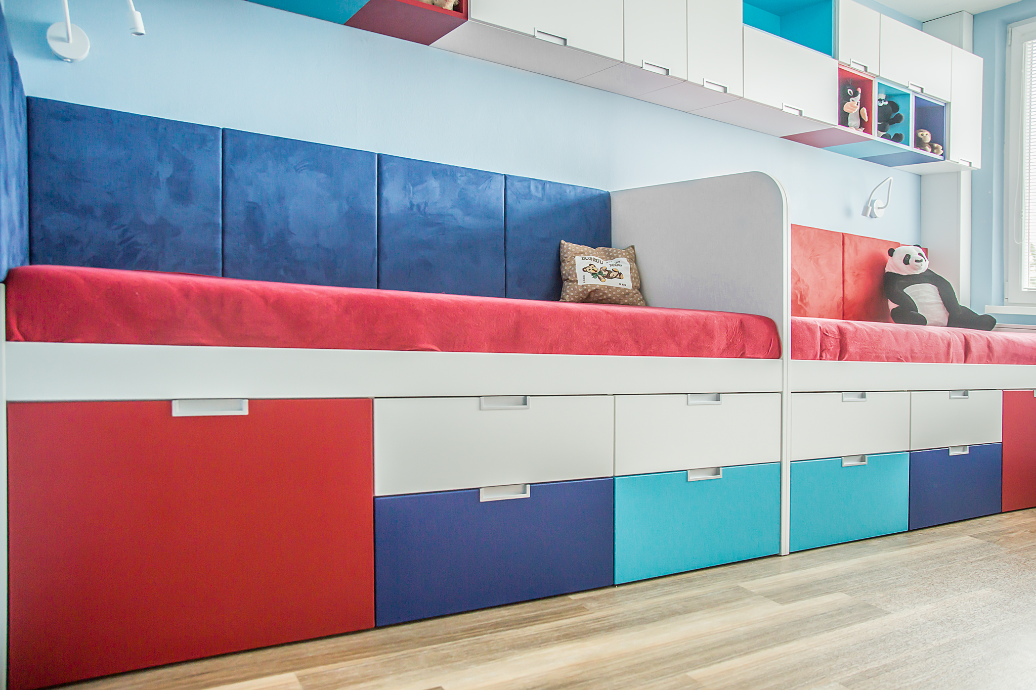Požadavek rodičů byl, aby nebyly postele nebyly patrové. Naštěstí rozměr toto rozmístění umožňoval. I přesto postele nabízejí dostatek úložného prostoru na hračky. Skříně vyhověly jak skládanému oblečení, tak věšení.