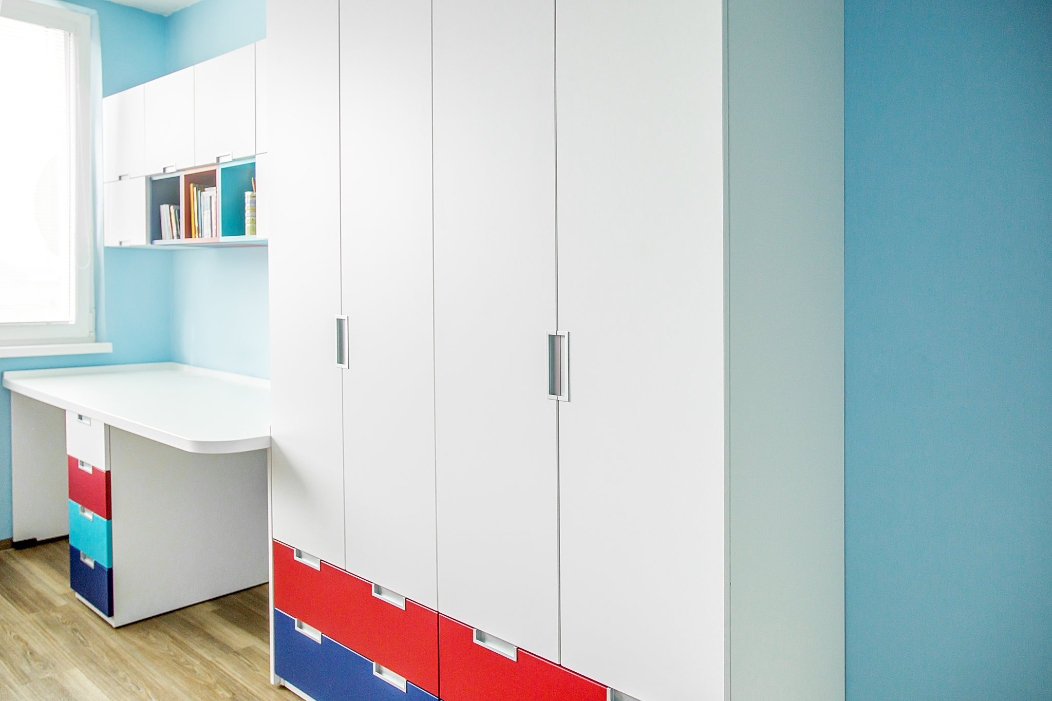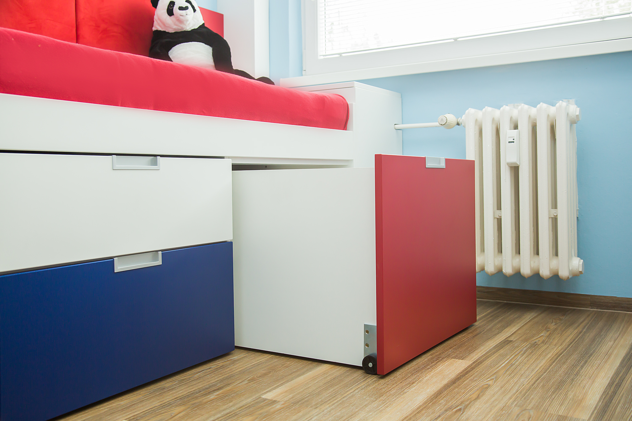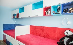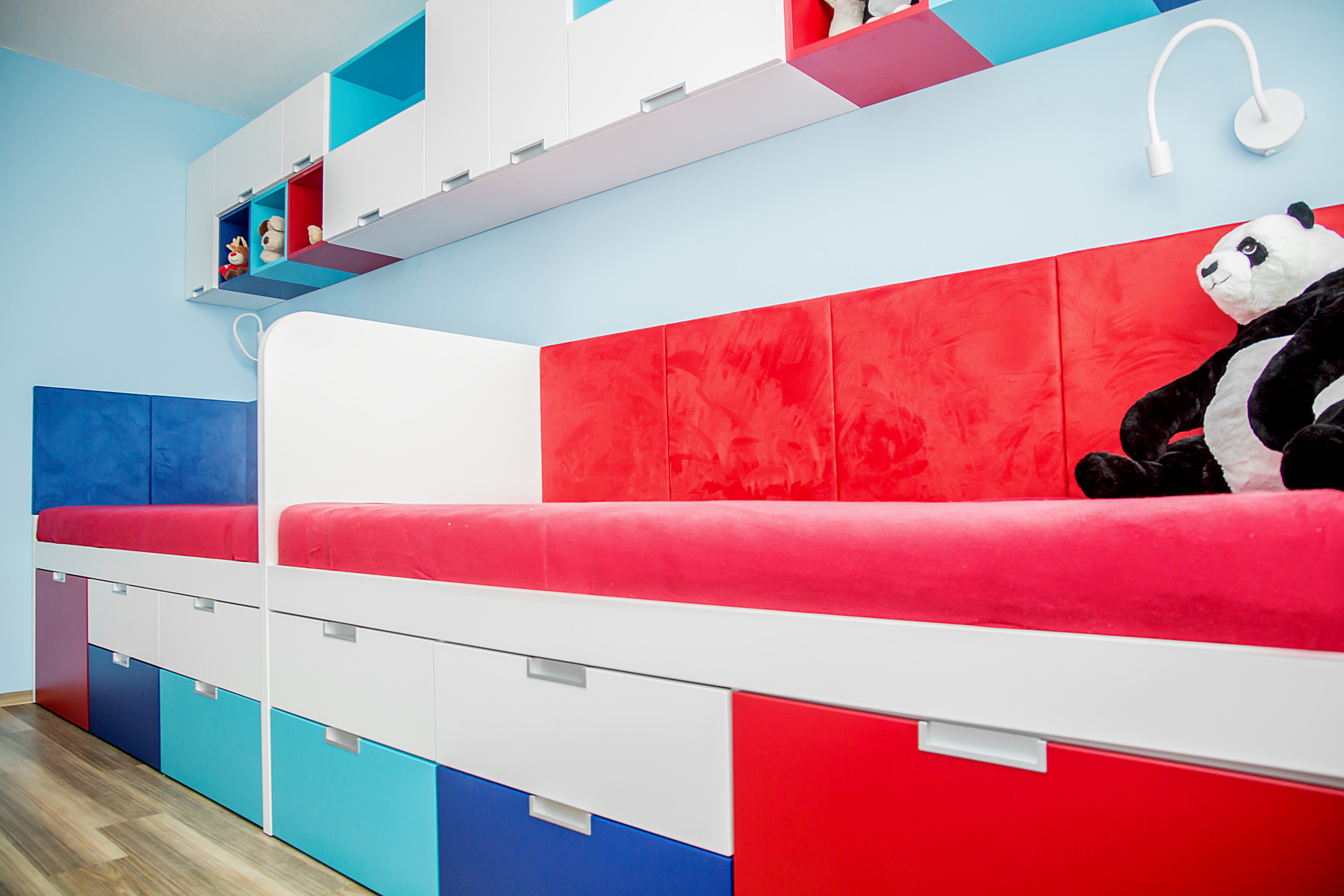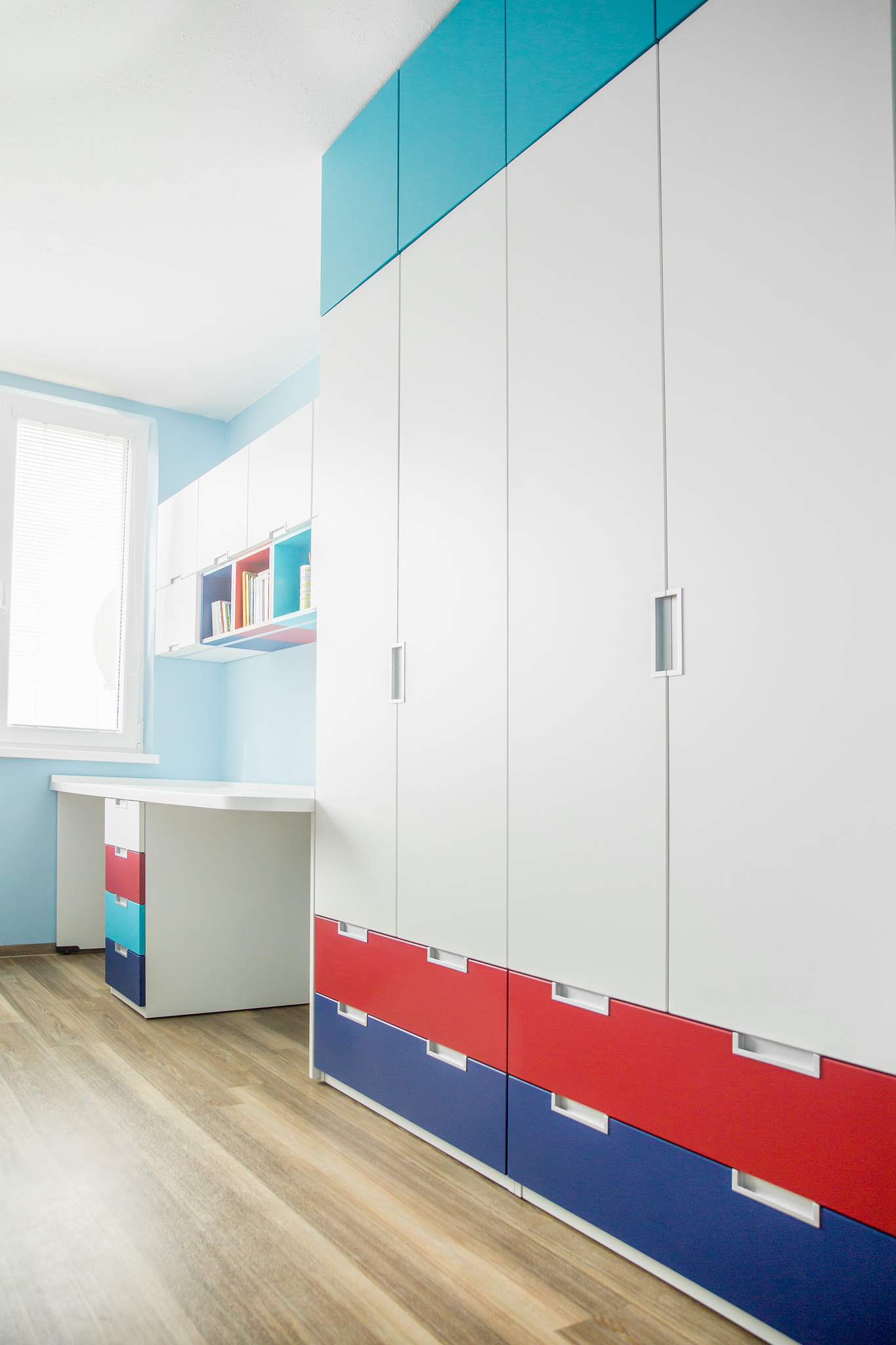 Požadavek rodičů byl, aby nebyly postele nebyly patrové. Naštěstí rozměr toto rozmístění umožňoval. I přesto postele nabízejí dostatek úložného prostoru na hračky. Skříně vyhověly jak skládanému oblečení, tak věšení.