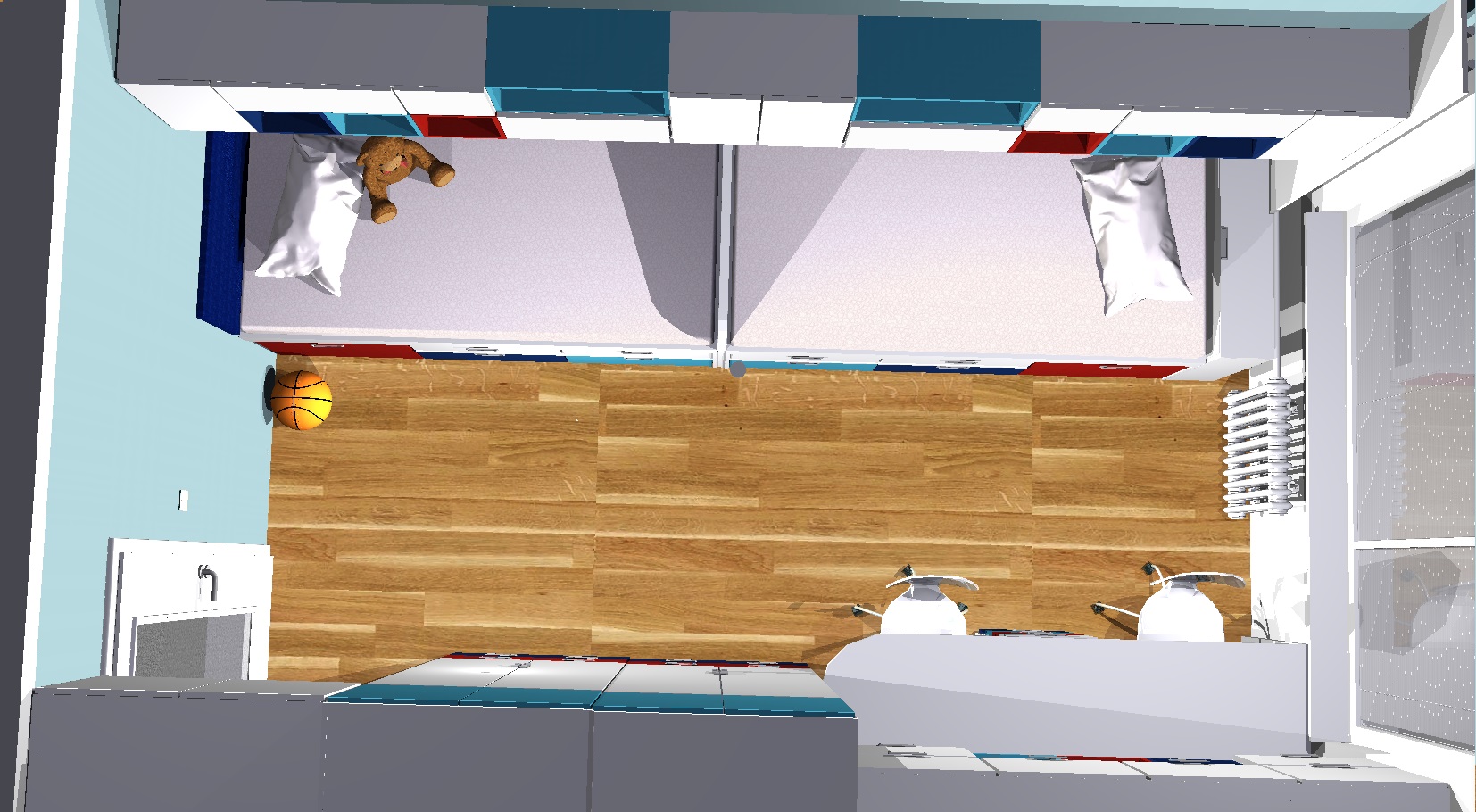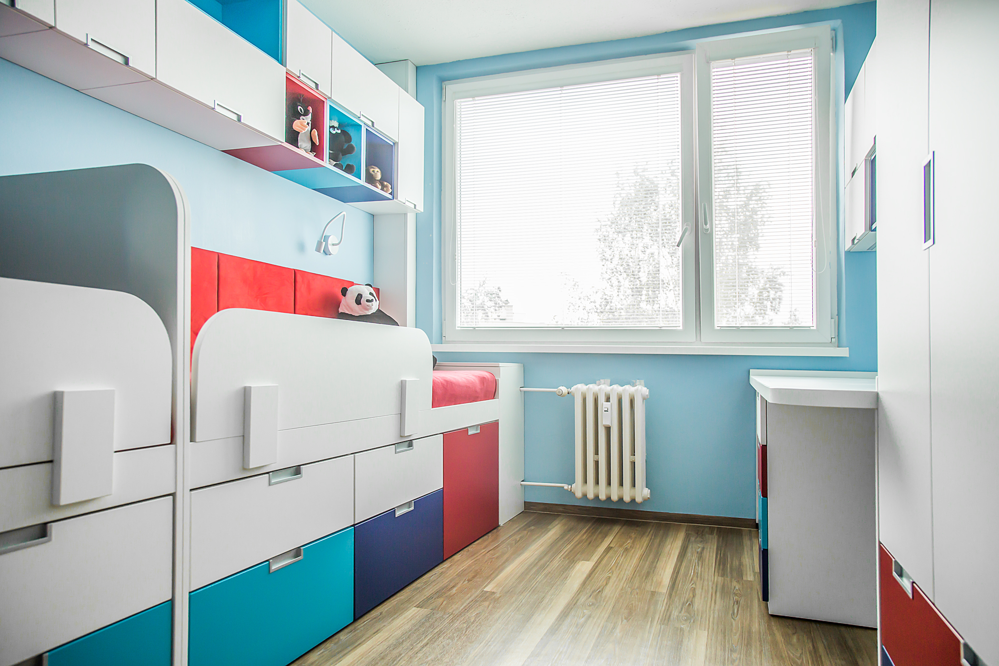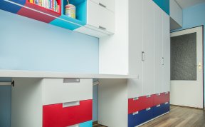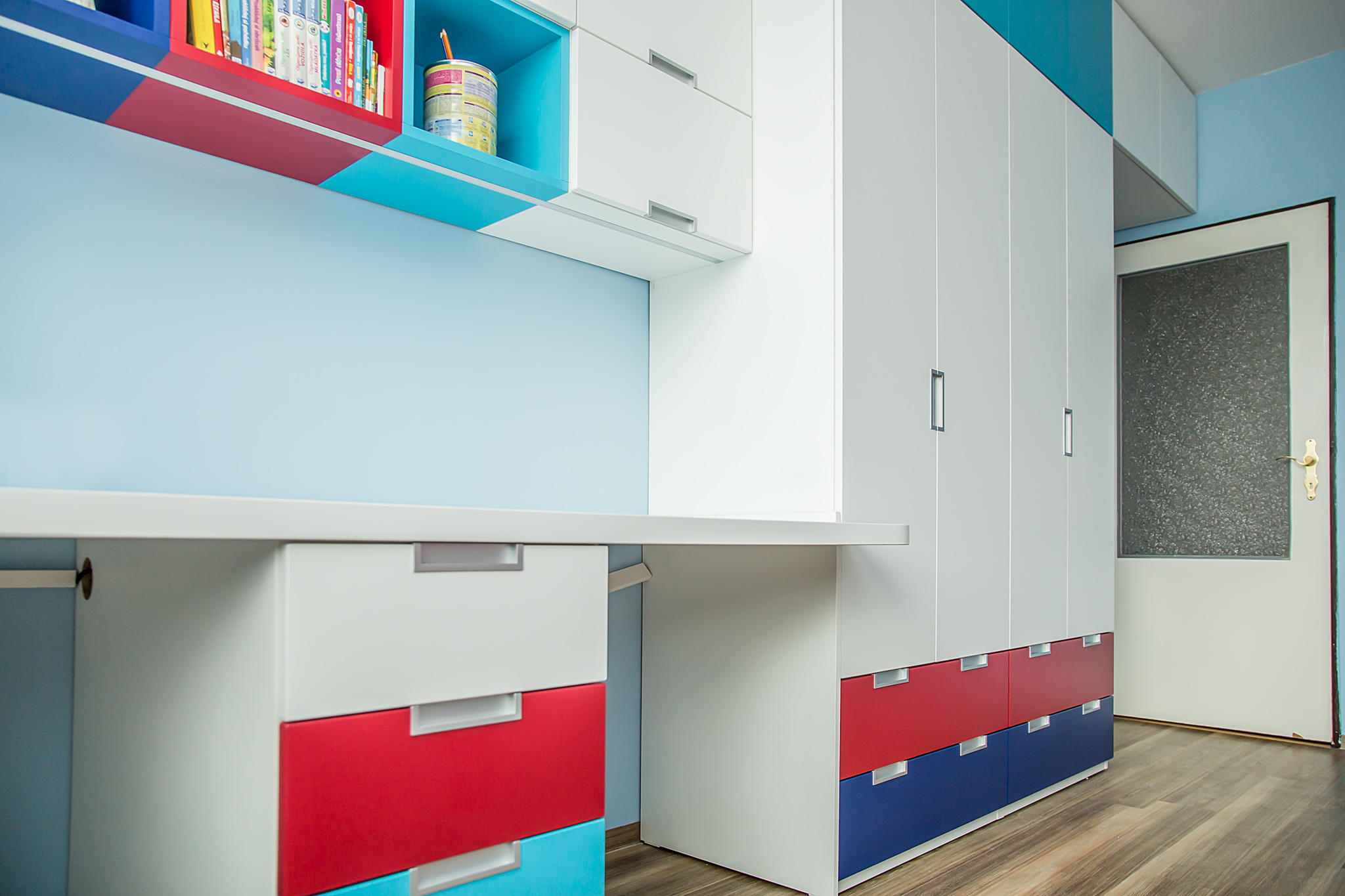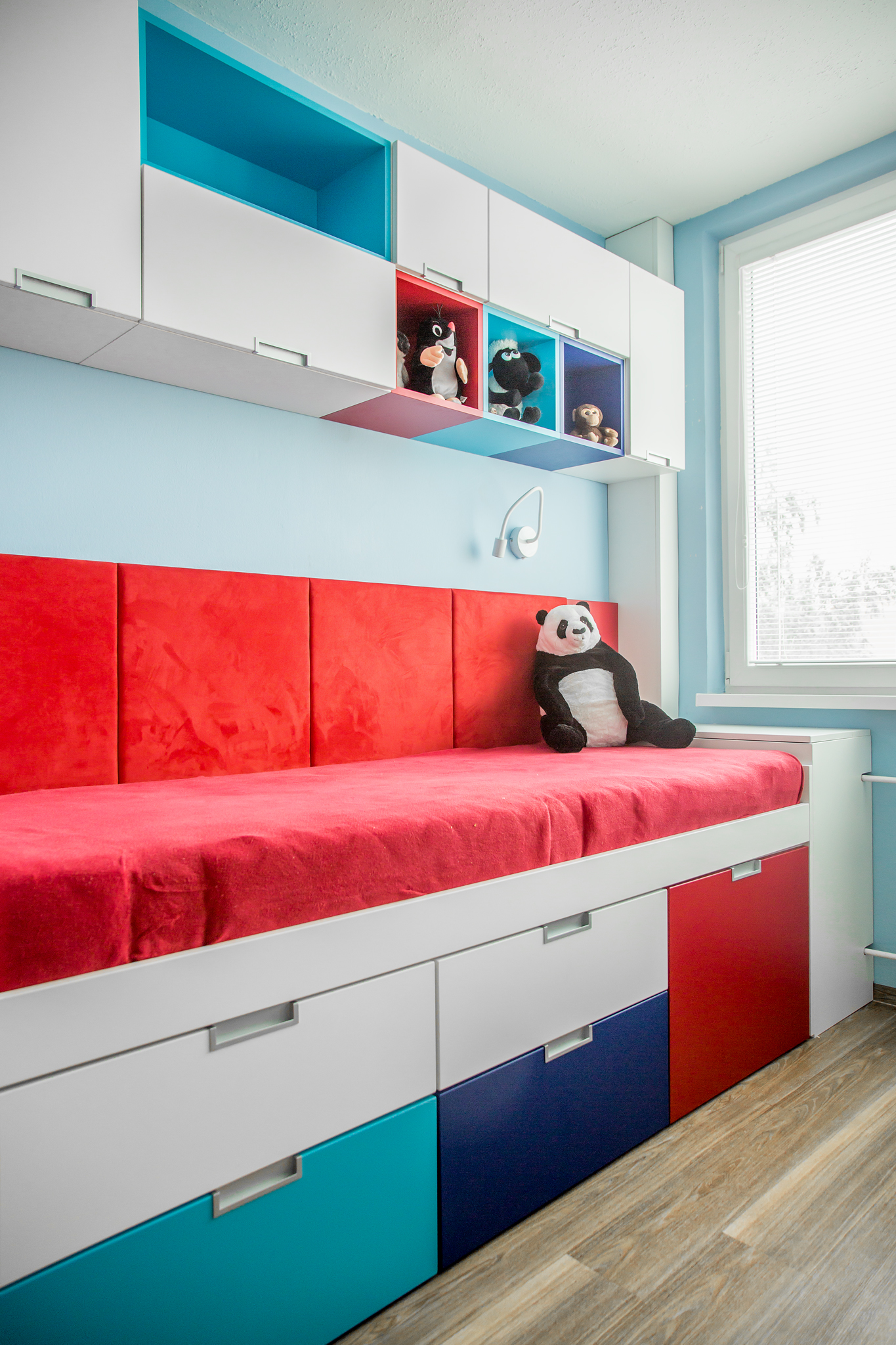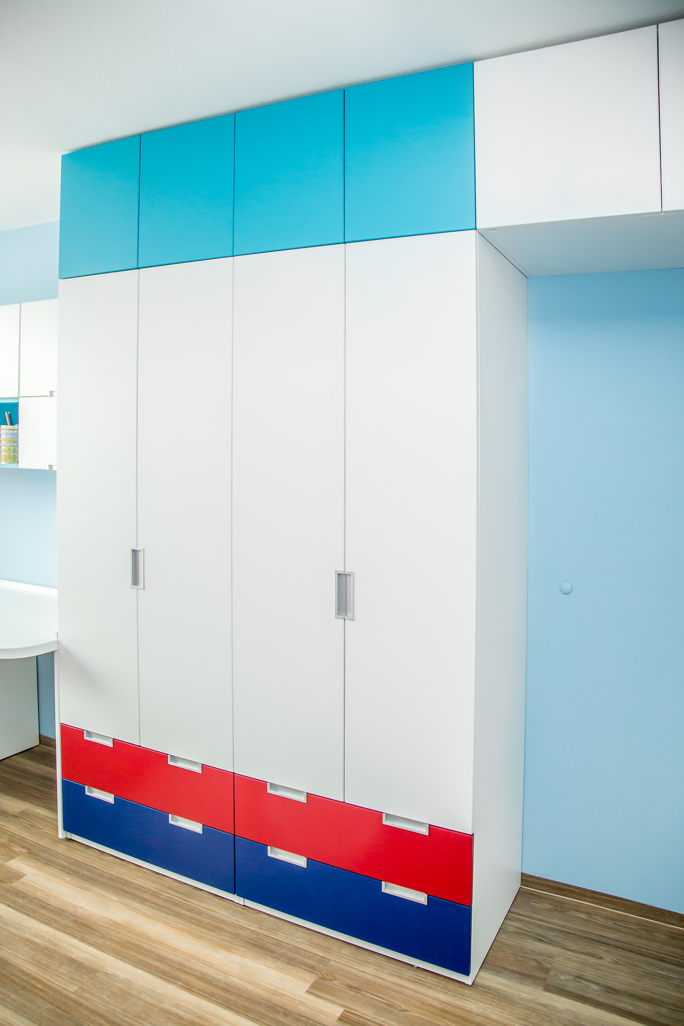Požadavek rodičů byl, aby nebyly postele nebyly patrové. Naštěstí rozměr toto rozmístění umožňoval. I přesto postele nabízejí dostatek úložného prostoru na hračky. Skříně vyhověly jak skládanému oblečení, tak věšení.