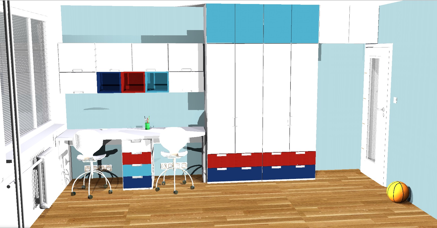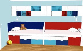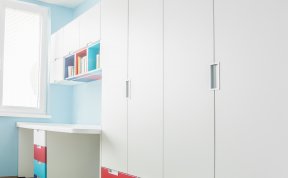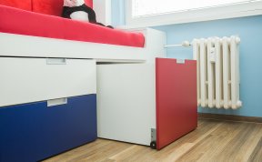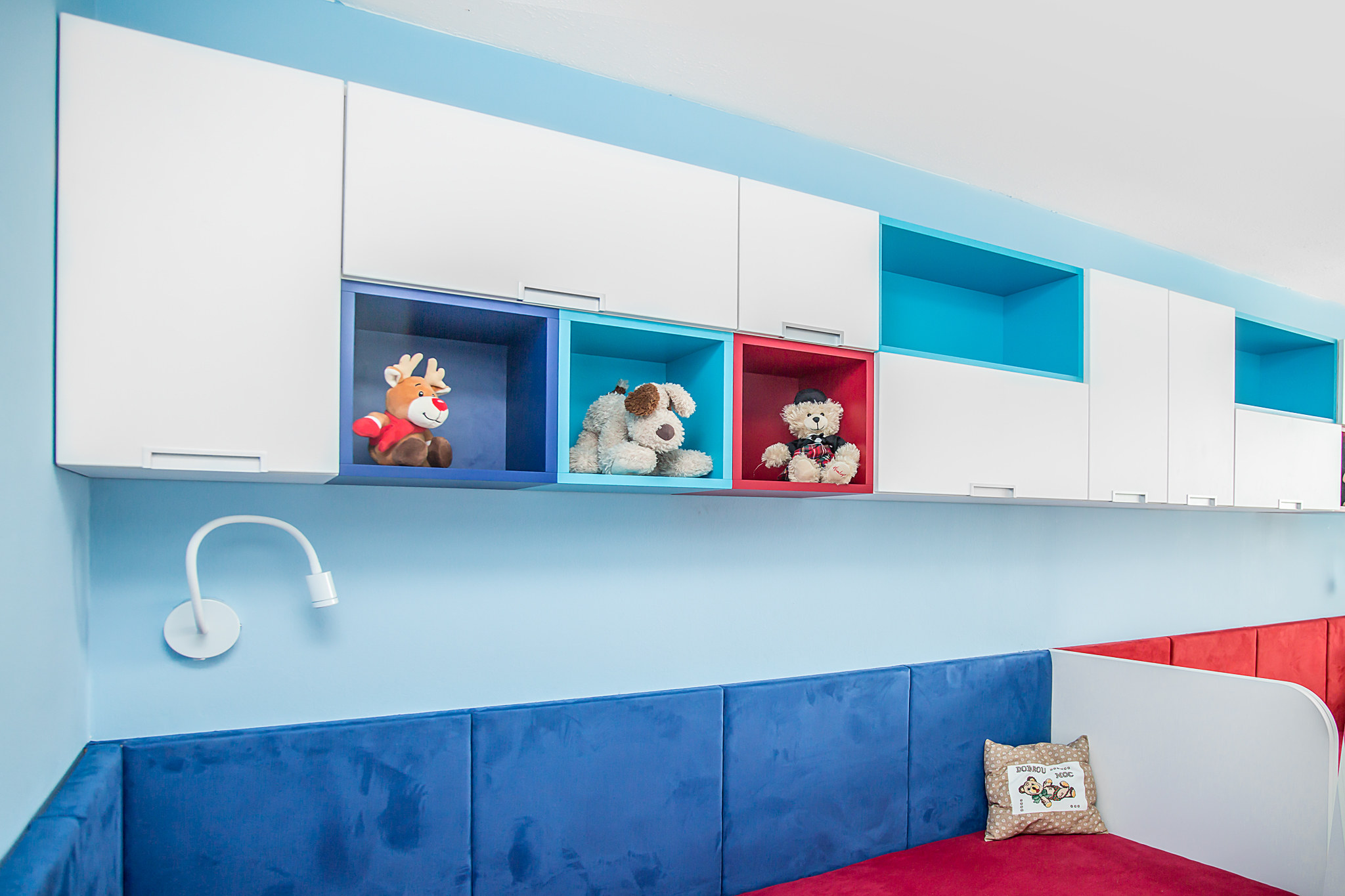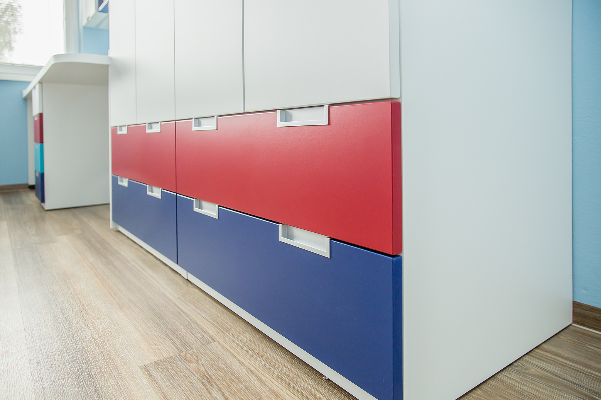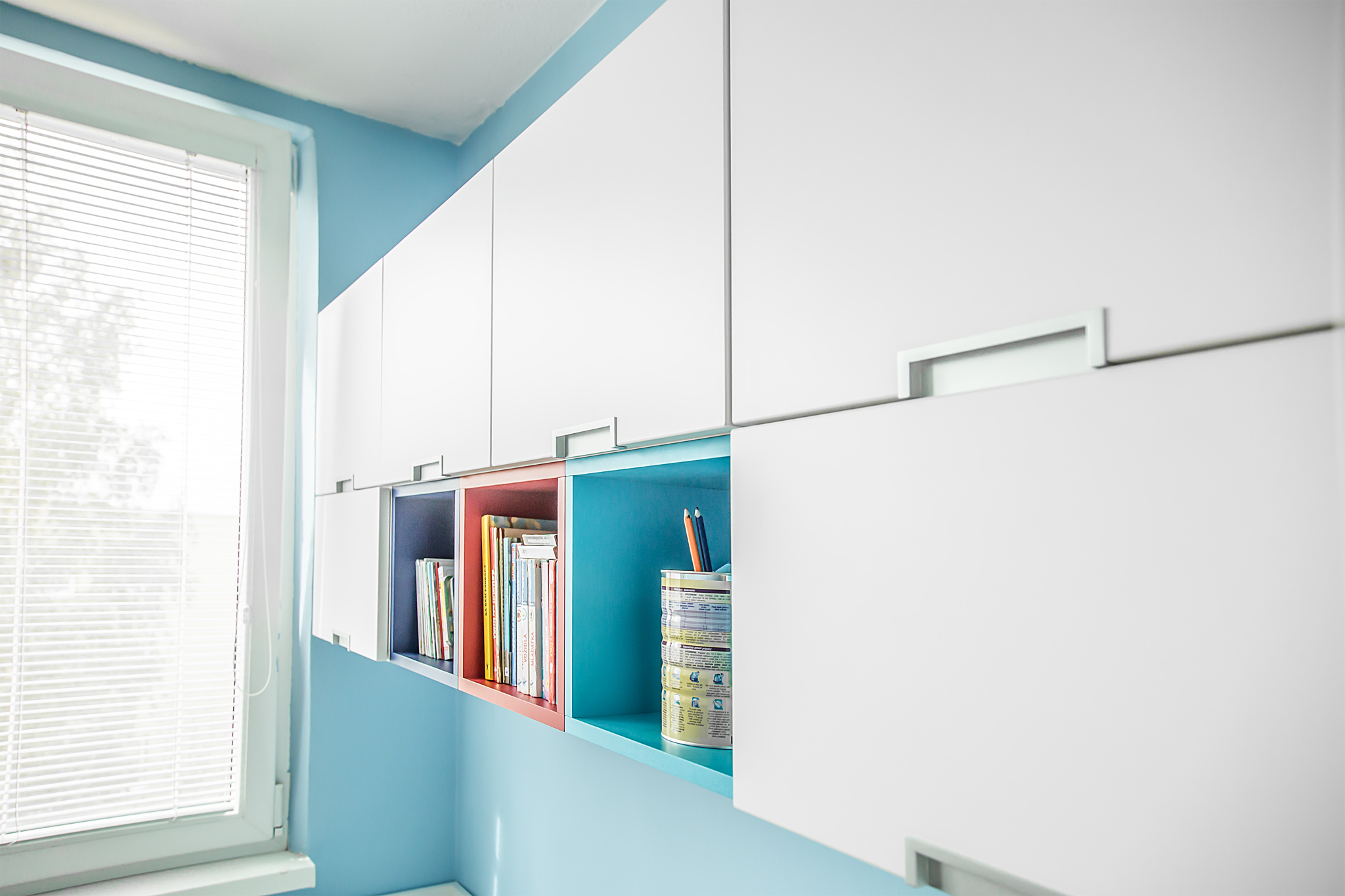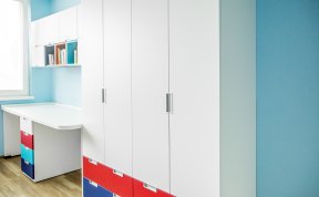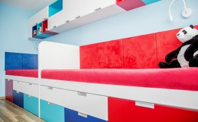 Požadavek rodičů byl, aby nebyly postele nebyly patrové. Naštěstí rozměr toto rozmístění umožňoval. I přesto postele nabízejí dostatek úložného prostoru na hračky. Skříně vyhověly jak skládanému oblečení, tak věšení.