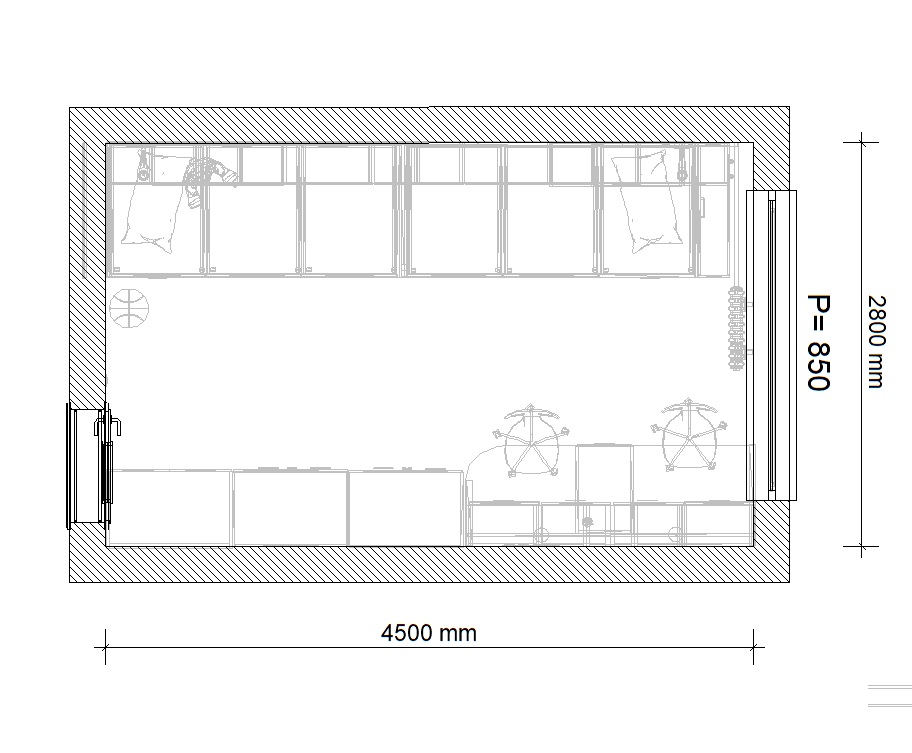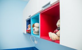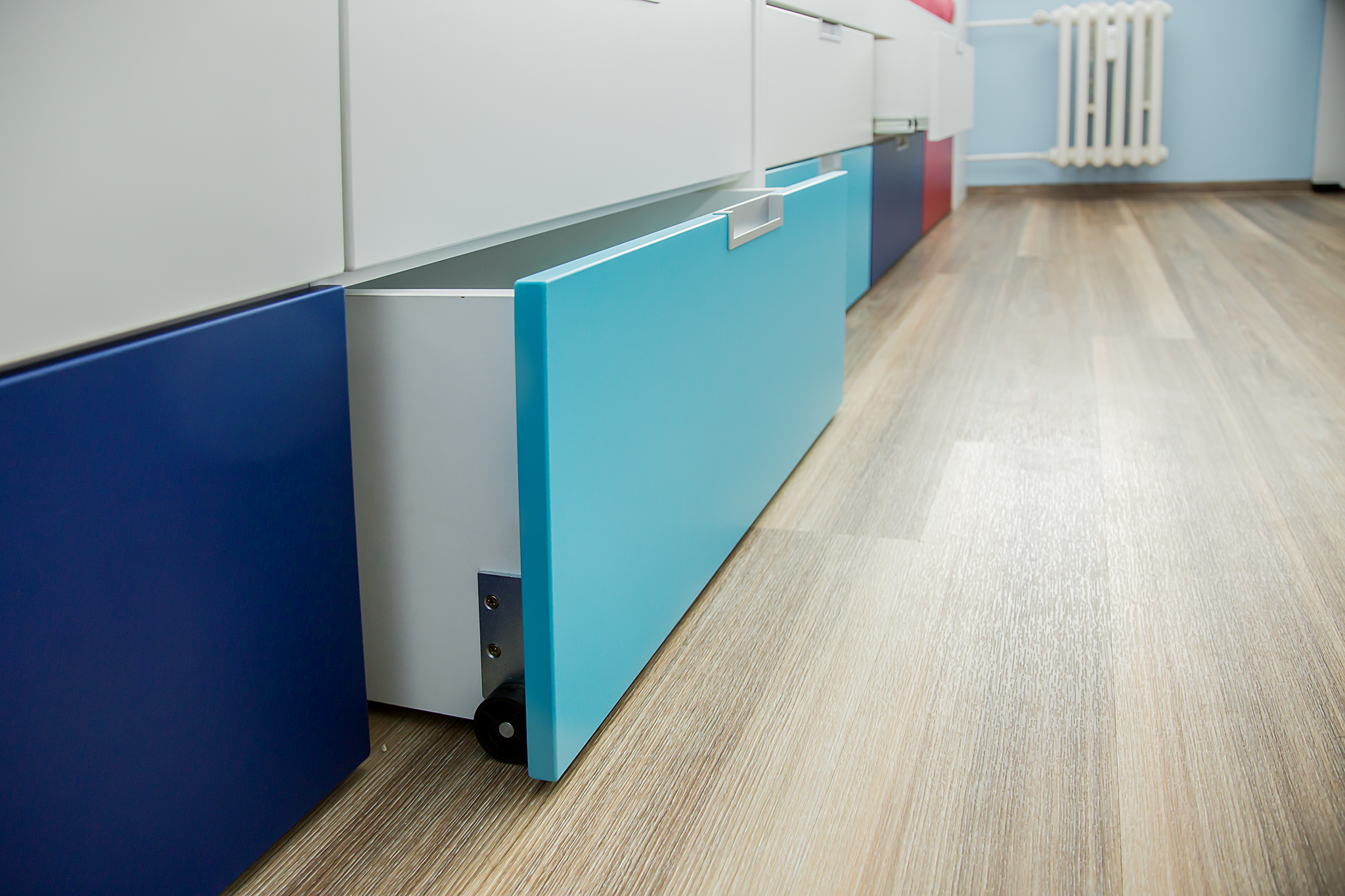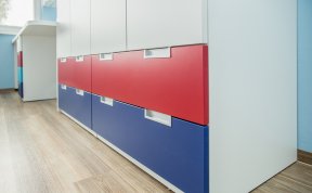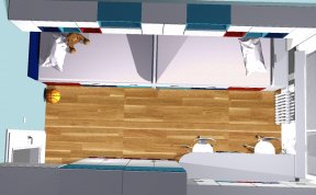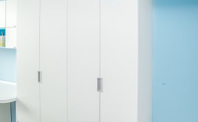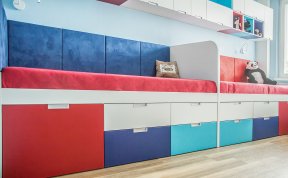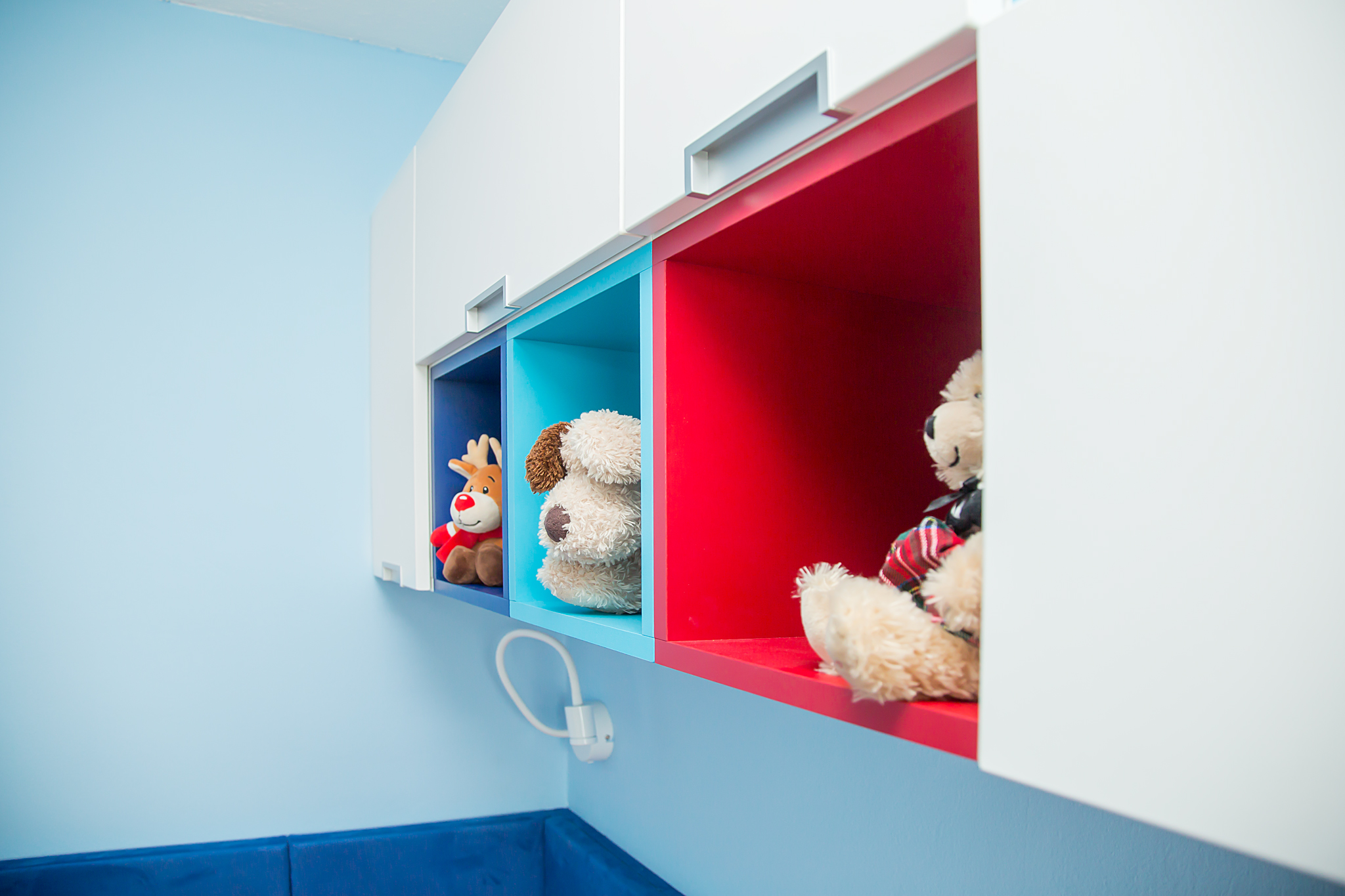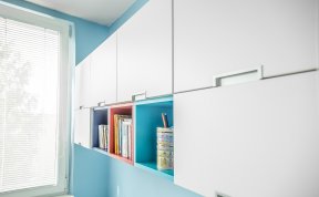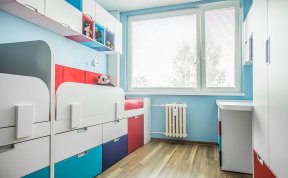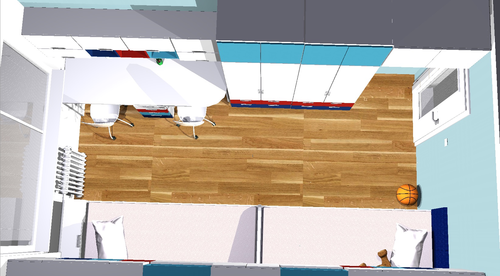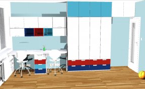 Požadavek rodičů byl, aby nebyly postele nebyly patrové. Naštěstí rozměr toto rozmístění umožňoval. I přesto postele nabízejí dostatek úložného prostoru na hračky. Skříně vyhověly jak skládanému oblečení, tak věšení.