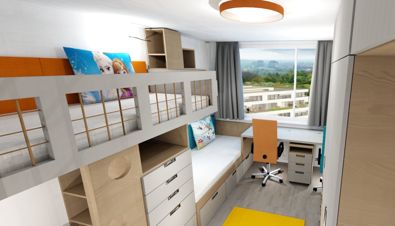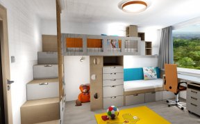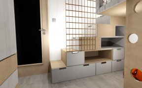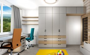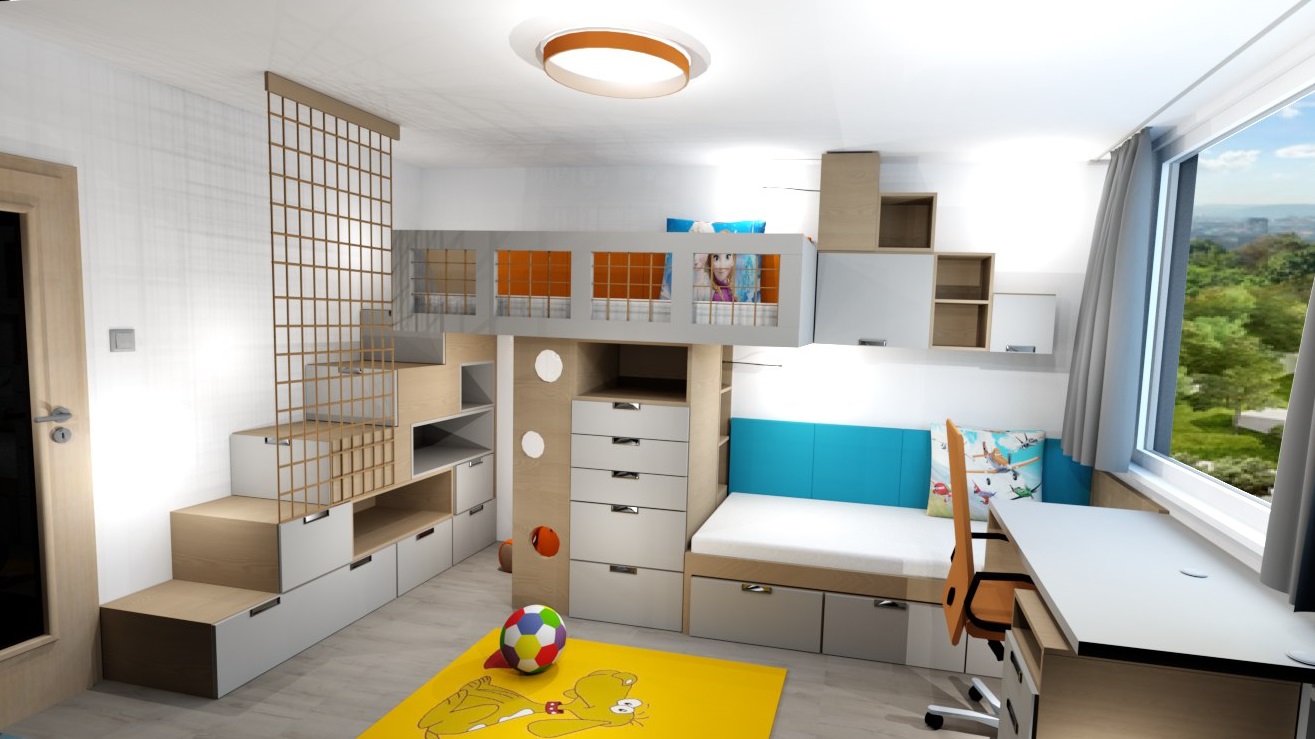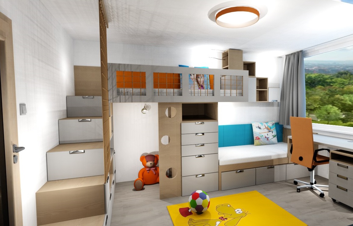 V pokojíčku jsme řešili hlavně hravý prostor a přitom účelný a s dostatkem úložných prostor. Úložné prostory tak vznikly ve schůdcích k horní posteli, pod horní postelí, také pod spodní postelí i nad spodní postelí a vyšly krásné dvě skříně s dostatkem šuplíků pro prádlo.