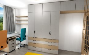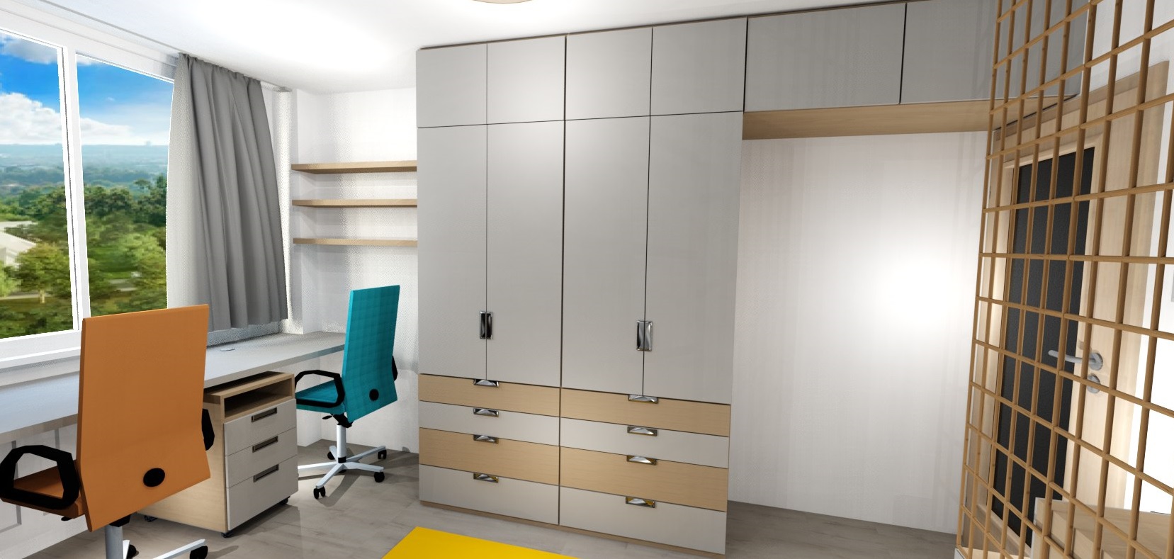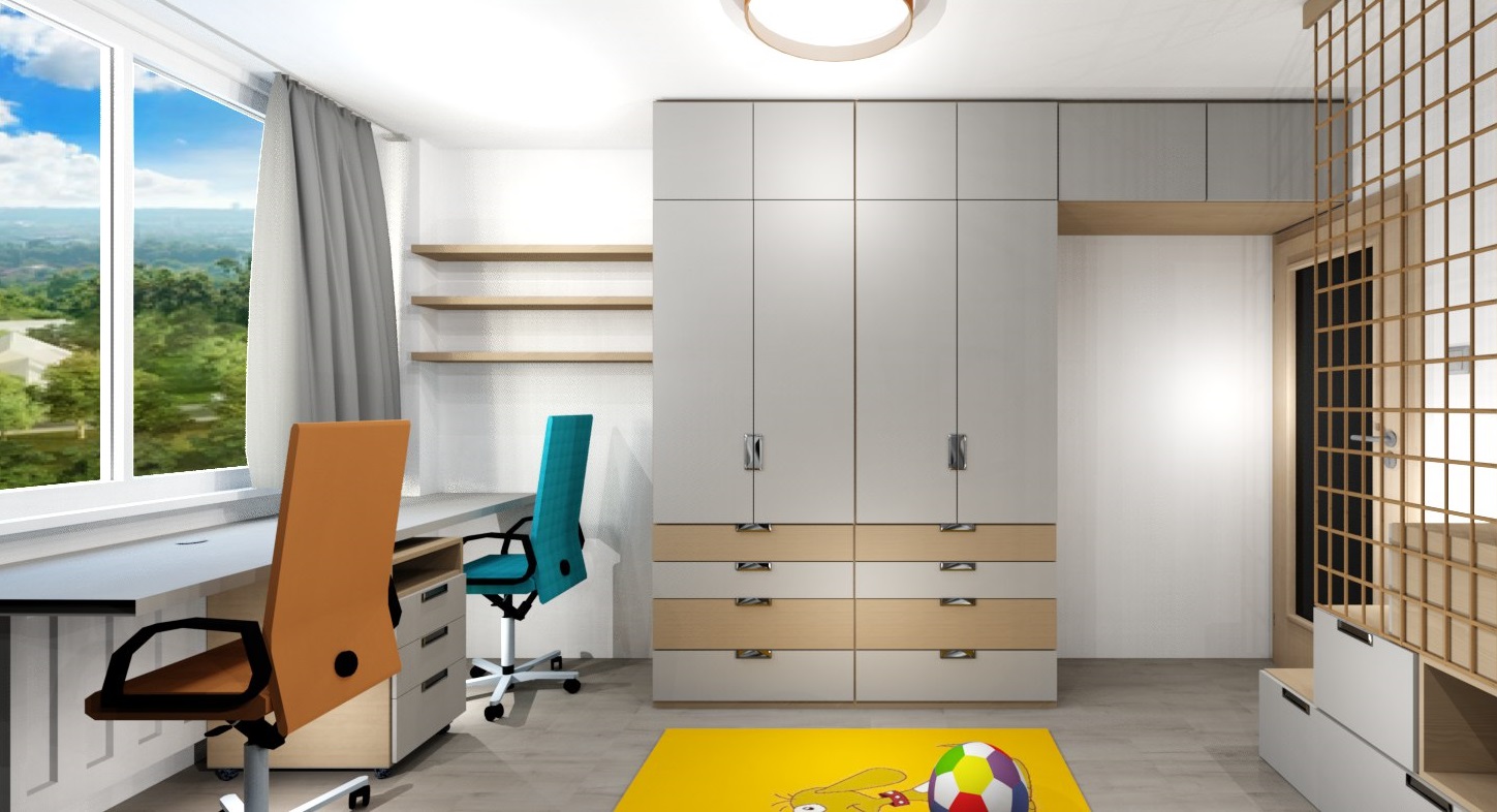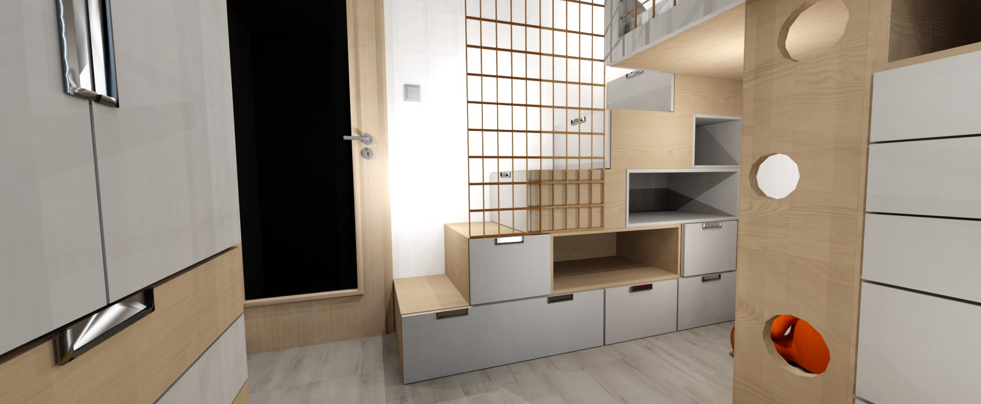 V pokojíčku jsme řešili hlavně hravý prostor a přitom účelný a s dostatkem úložných prostor. Úložné prostory tak vznikly ve schůdcích k horní posteli, pod horní postelí, také pod spodní postelí i nad spodní postelí a vyšly krásné dvě skříně s dostatkem šuplíků pro prádlo.