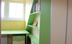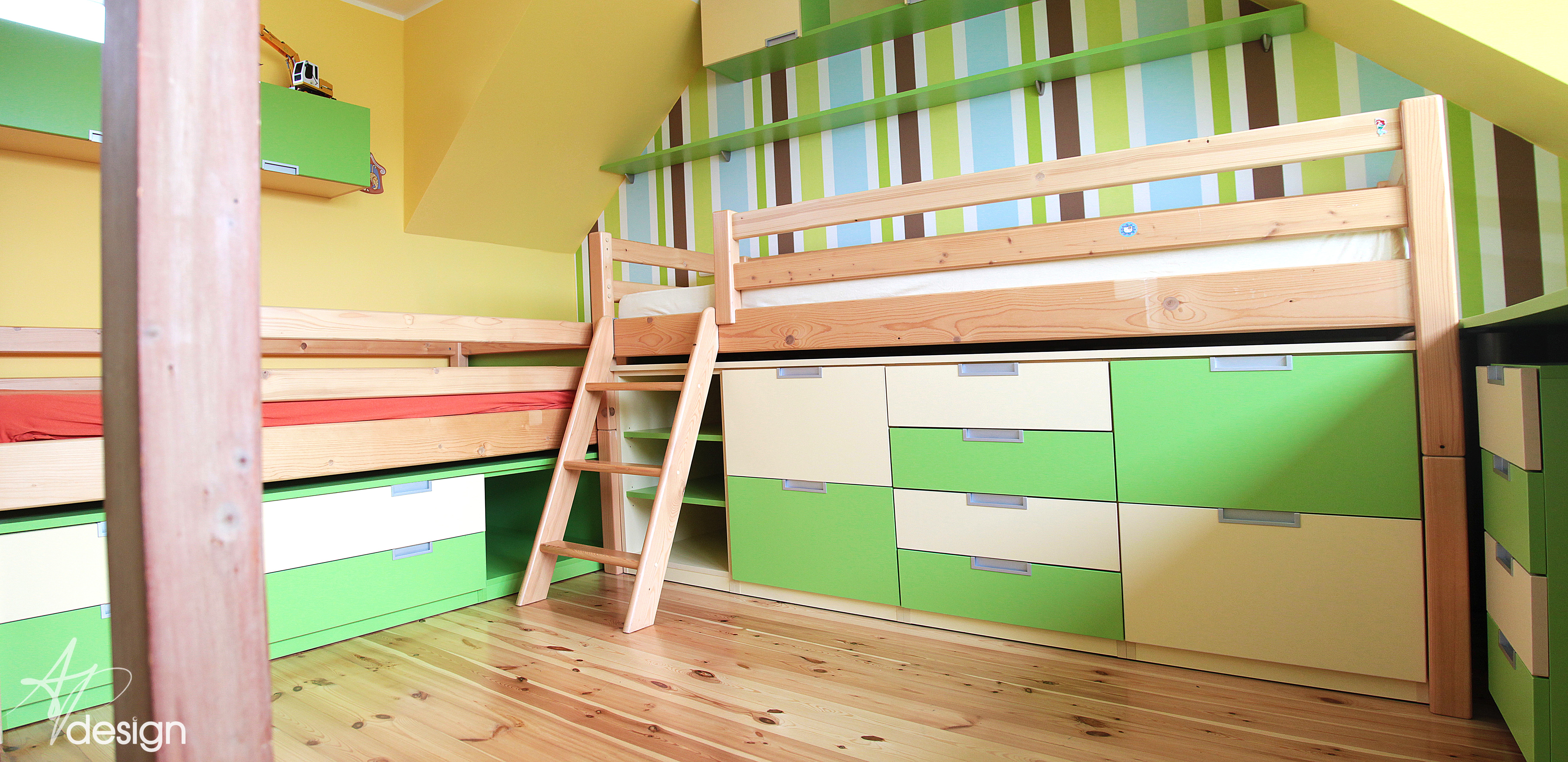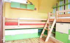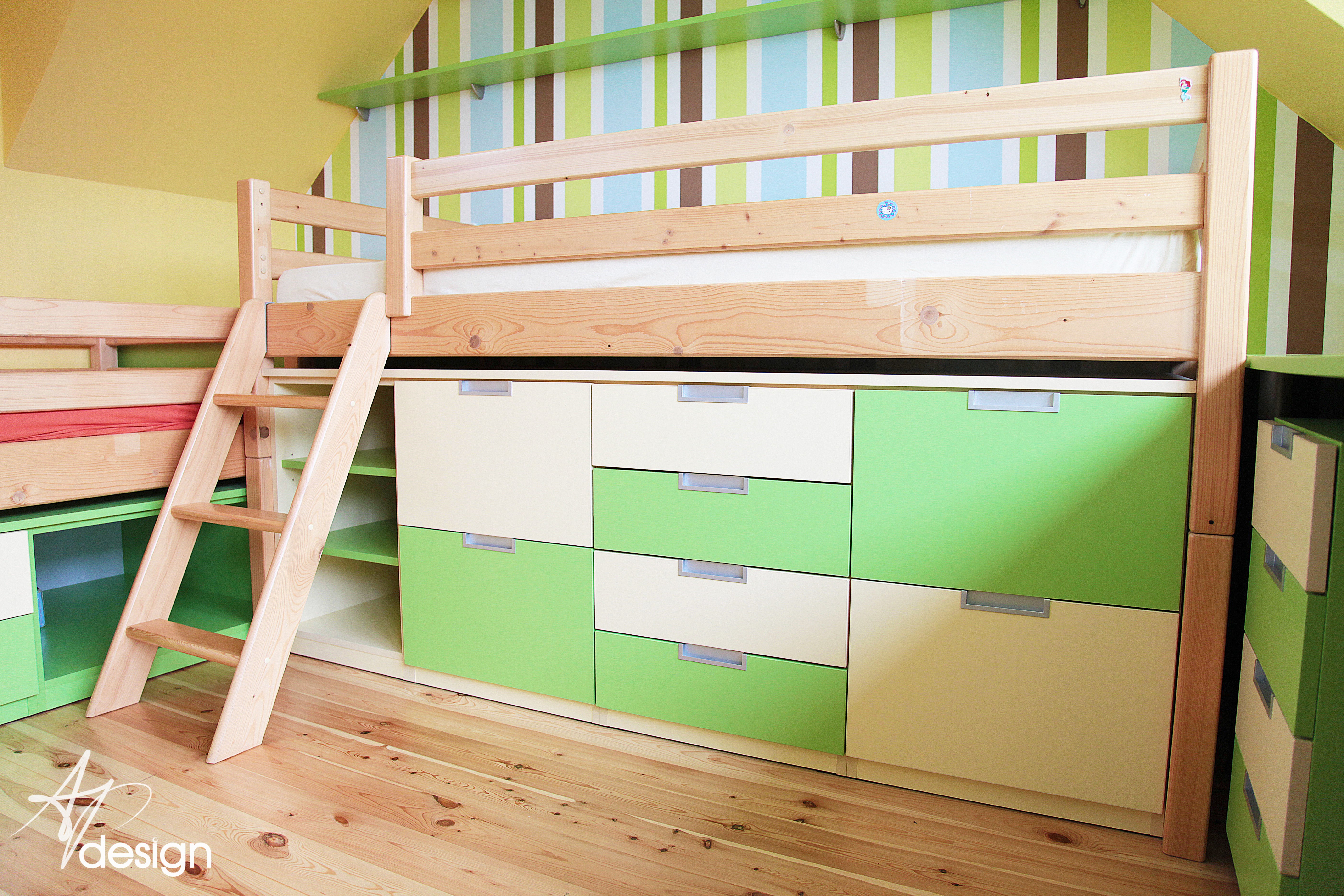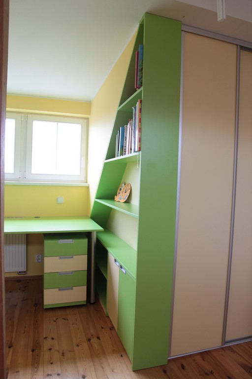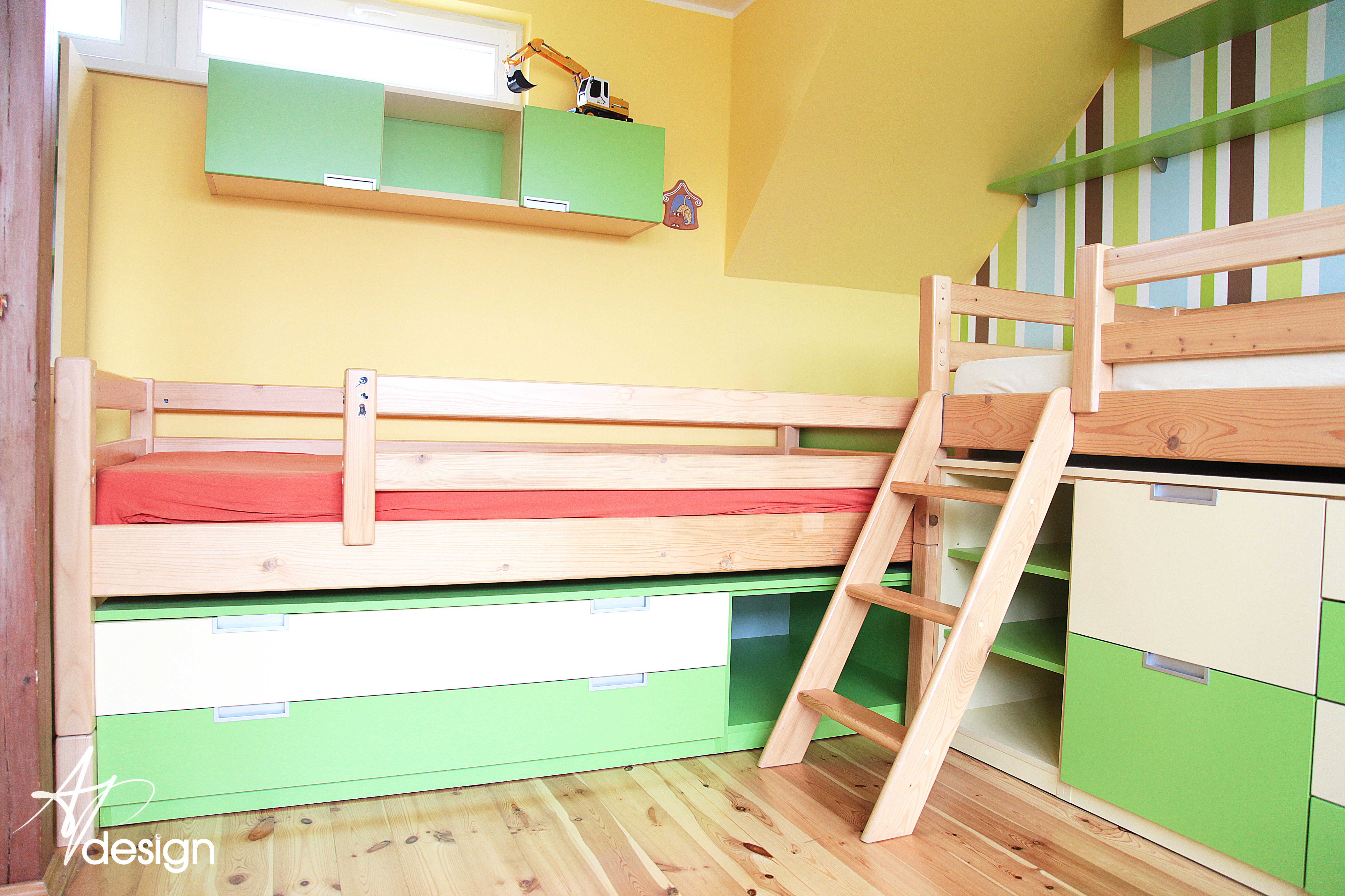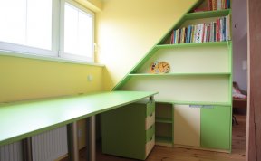 Klienti chtěli malé podkroví proměnit na dětský pokoj. Postele již děti měly, takže jsem navrhla řešení úložných prostor pod a nad postelemi. Protože děti byly předškláci, bylo potřeba pracovních stolů a nějaké knihovny.