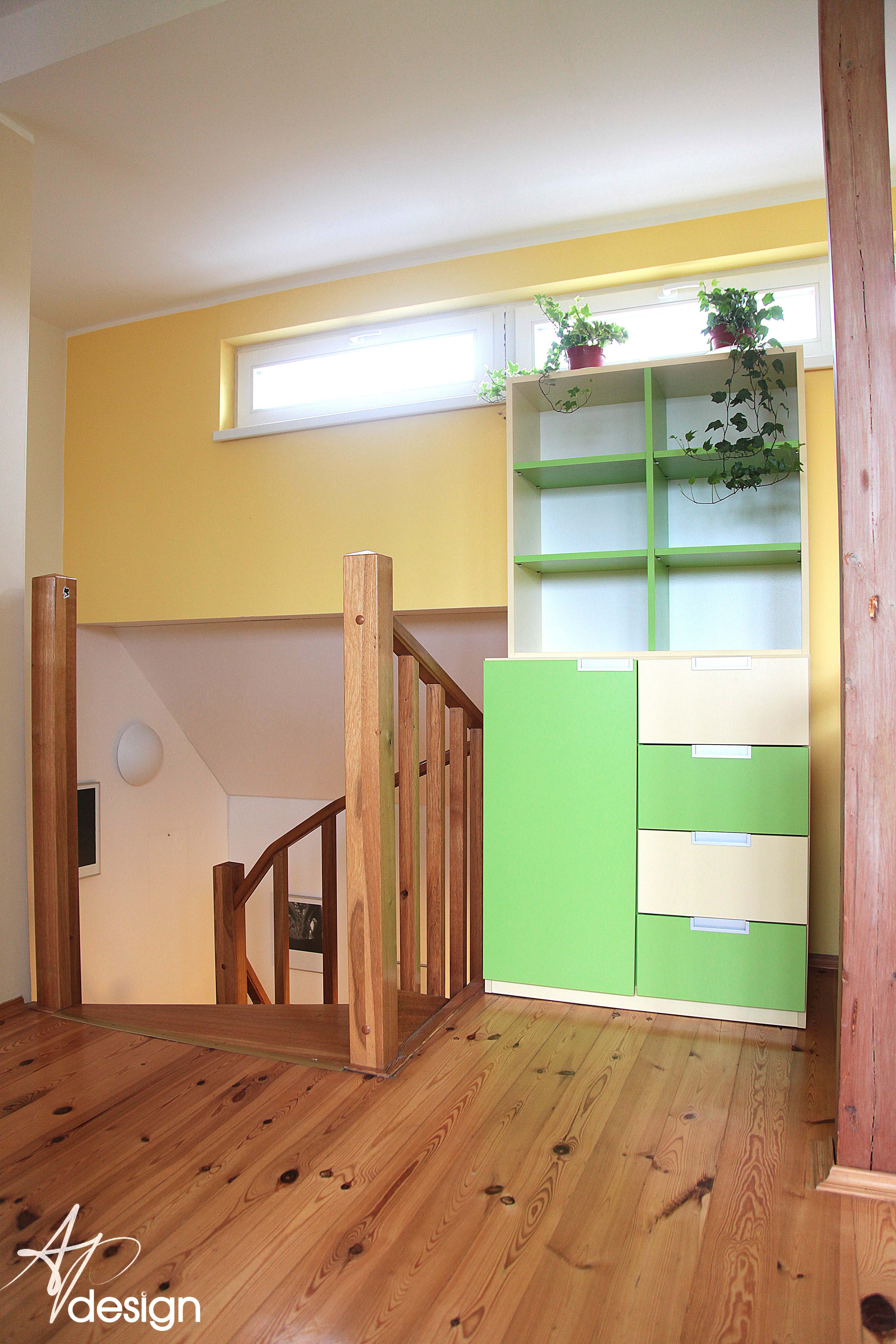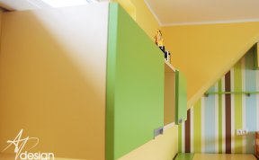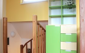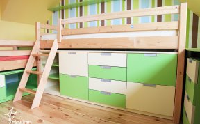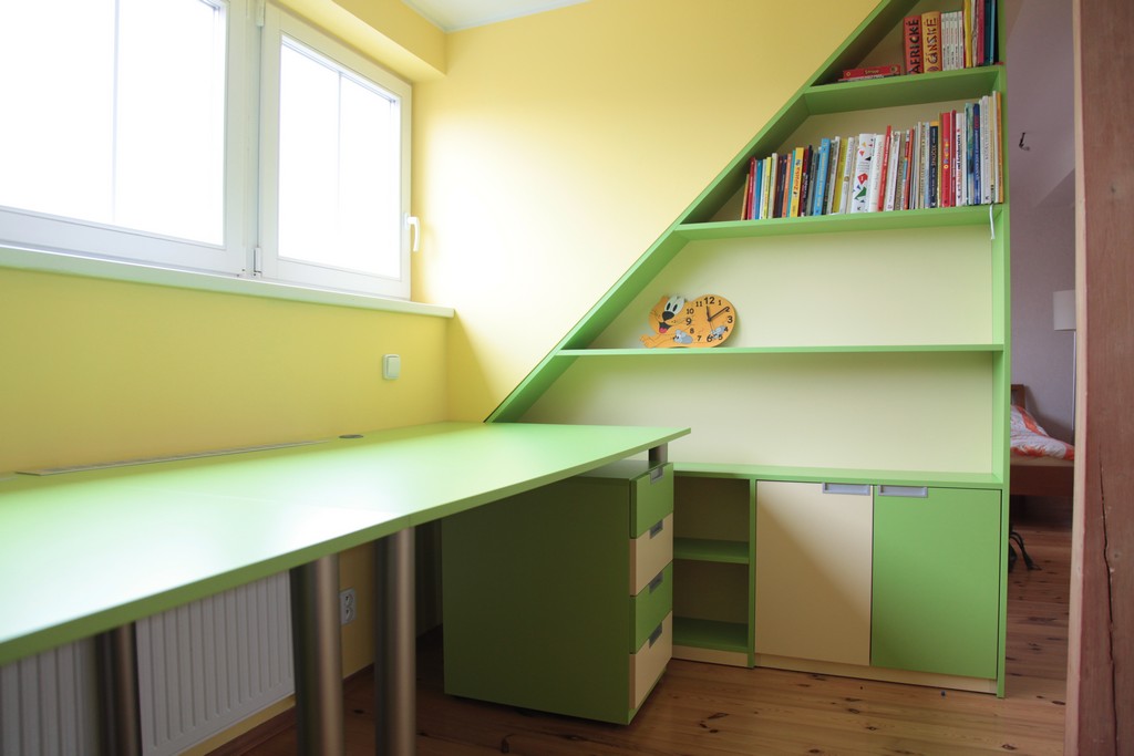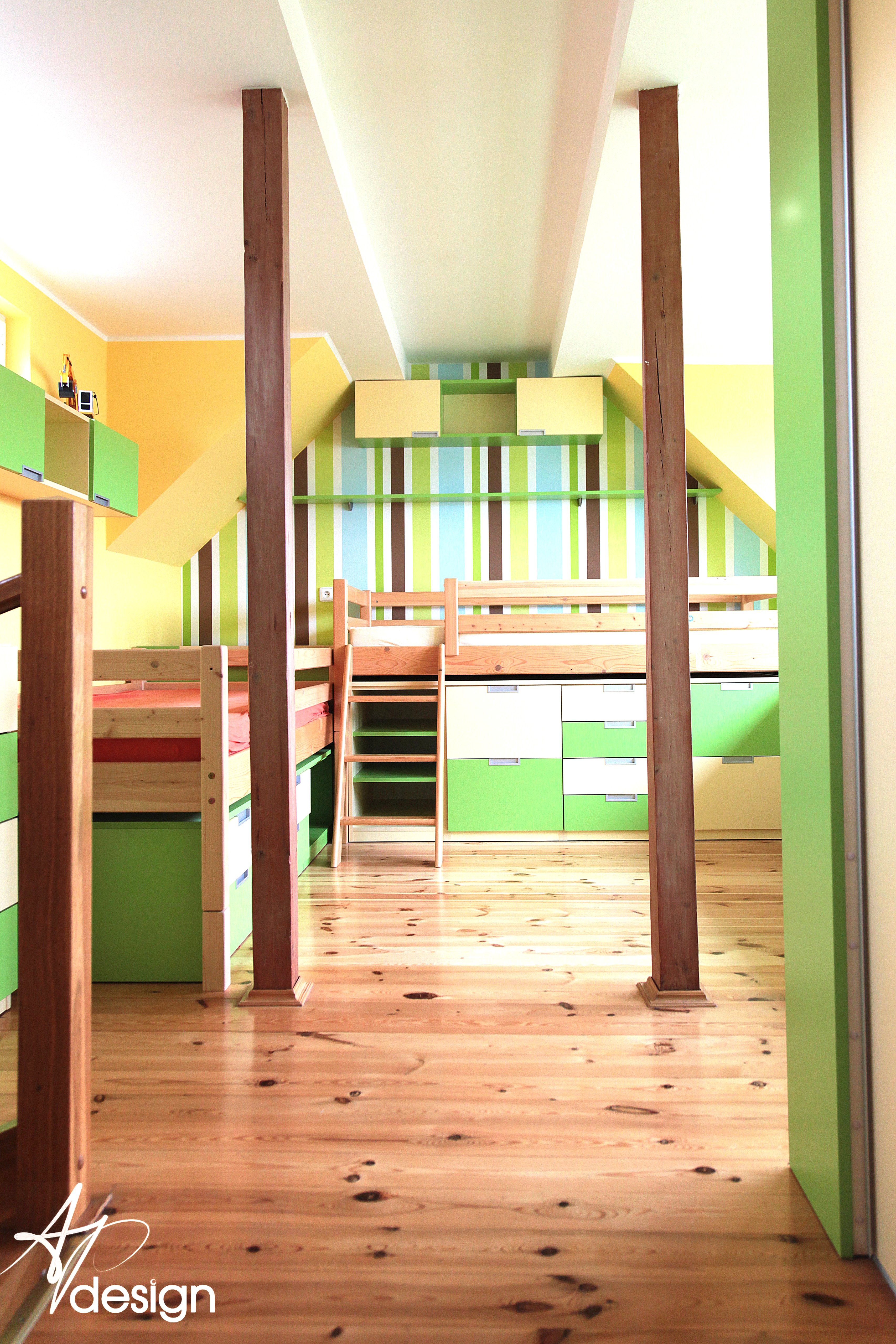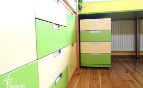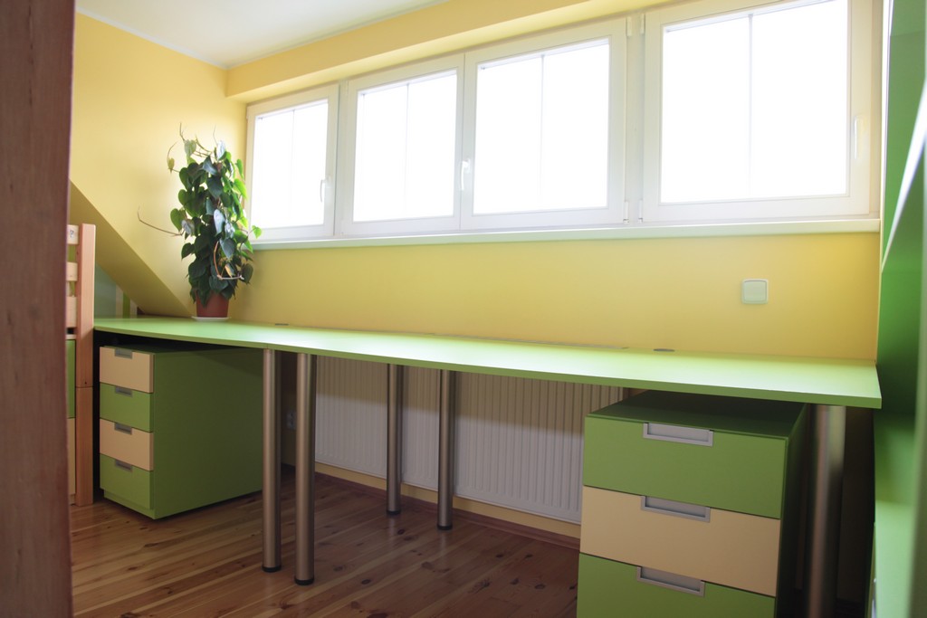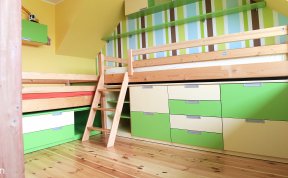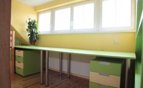 Klienti chtěli malé podkroví proměnit na dětský pokoj. Postele již děti měly, takže jsem navrhla řešení úložných prostor pod a nad postelemi. Protože děti byly předškláci, bylo potřeba pracovních stolů a nějaké knihovny.