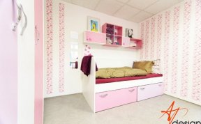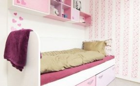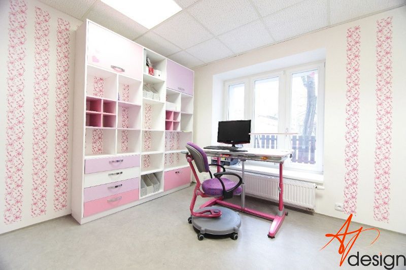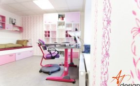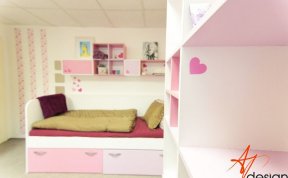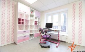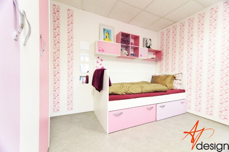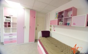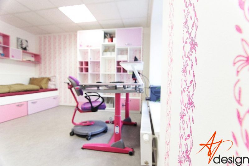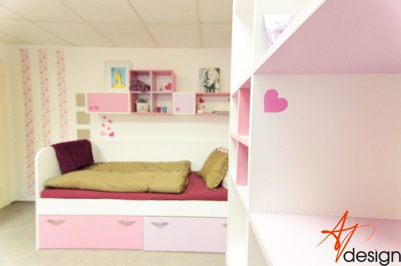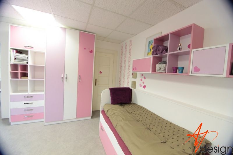 Vzorkovna je uspořádána tak, že u vstupu je sezení s knihovnou - na které mají klienti možnost vidět typy materiálů a dvířek používaných na nábytek. Ve druhé místnosti je vyvzorovaný holčičí dětský pokoj, doplněný o rostoucí stůl a židli, které jsou v nabídce AP Design.